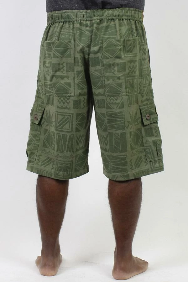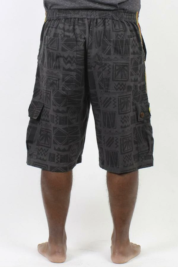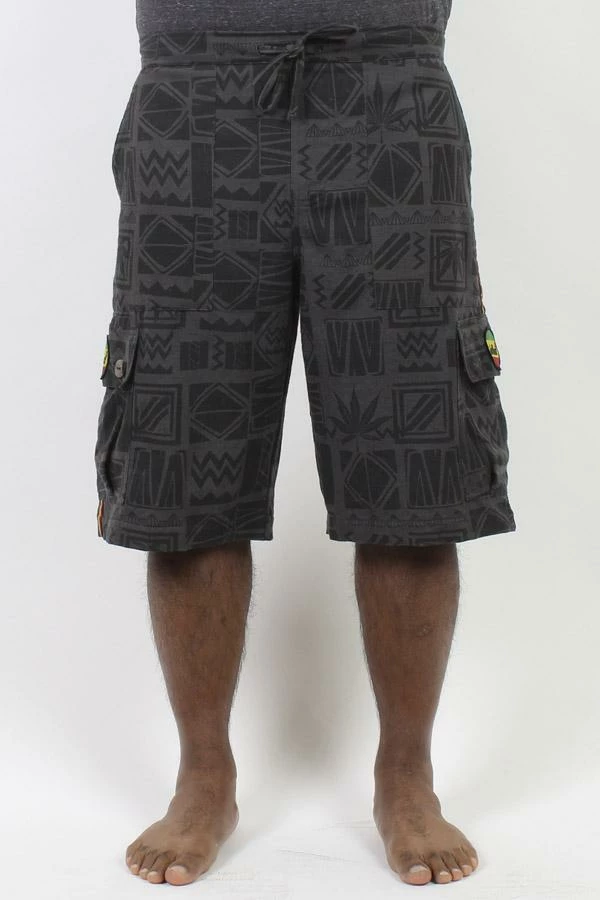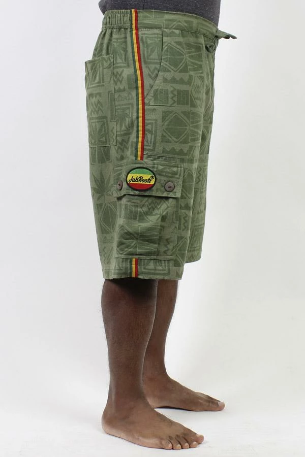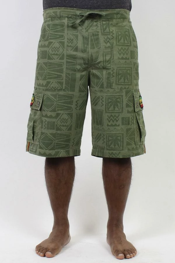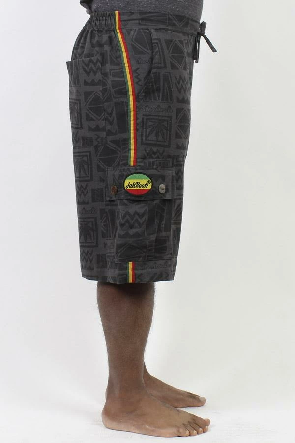 Our hemp blend cargo shorts are perfect for Rasta festivals and for any hot day. The print is a vintage 90’s style with island reggae inspirations, with the occasional ganja leaf. The side seams are trimmed with Rasta stripe ribbon, and the pocket flaps have JahRoots patches to show your true colors. The shorts are an easy fit with an elastic back and drawstring front waistband, and knee length for a casual look. Â