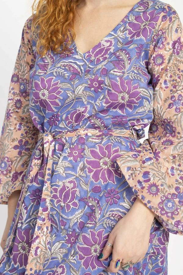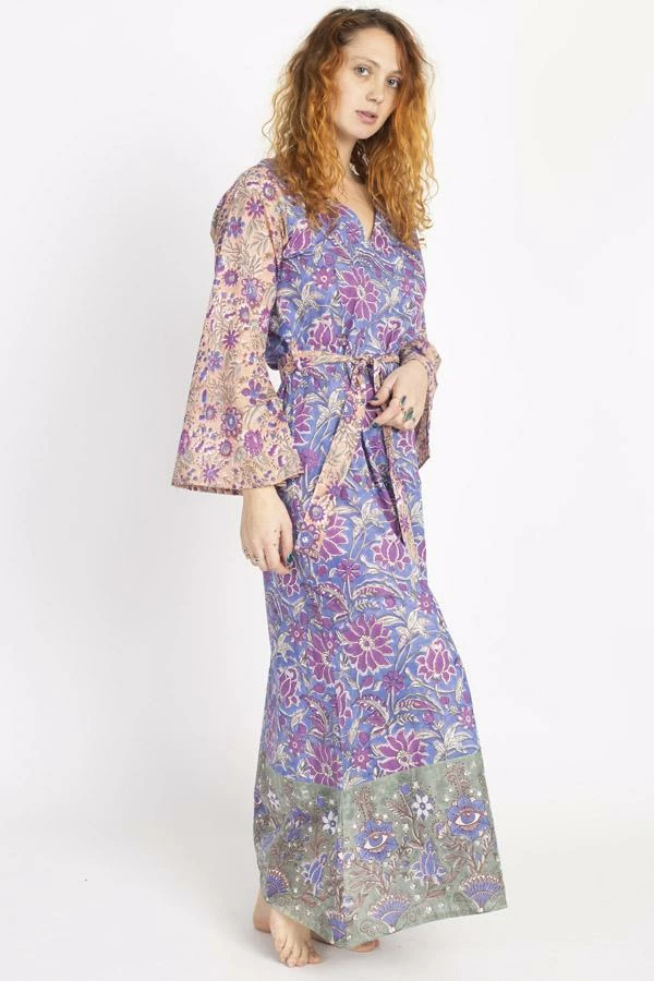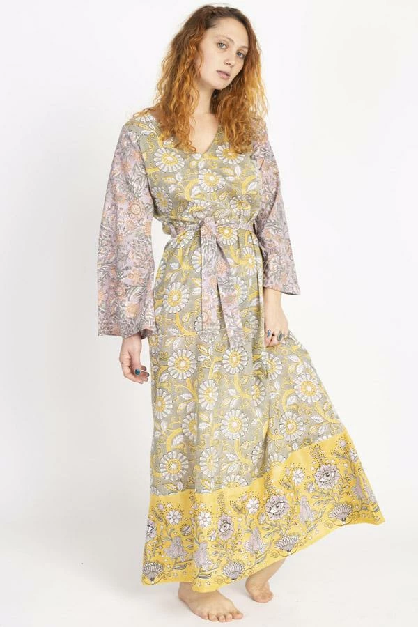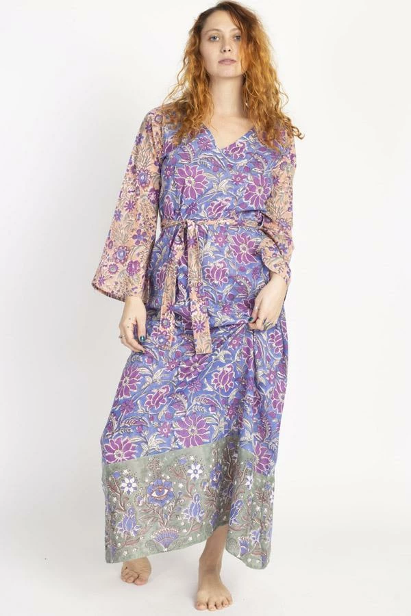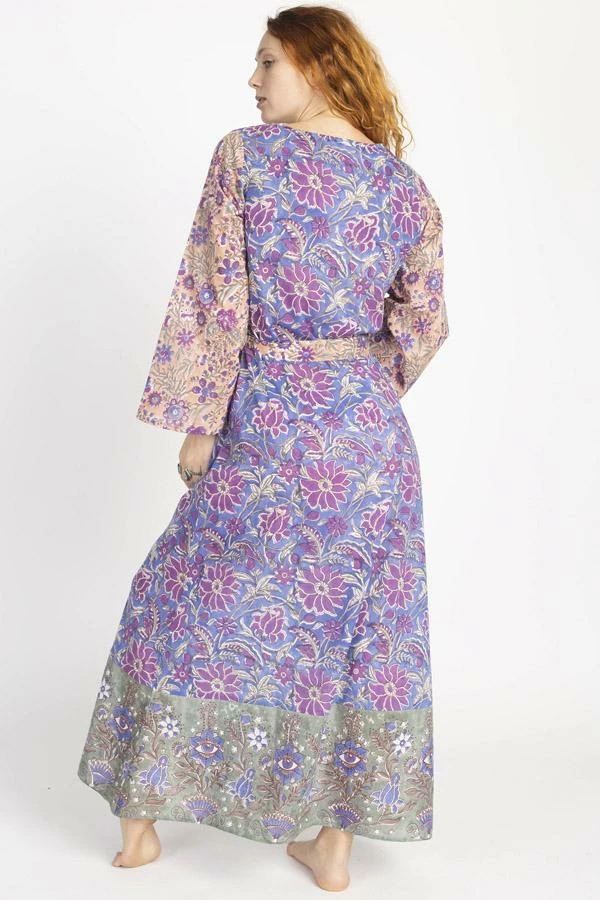 Open your third eye in this easy fit maxi caftan dress. Its made of the lightest cotton voile with contrasting wide bell sleeves. Each dress is hand block printed in India, using a process that is centuries old. The pattern is a combination of beautiful florals with a wide third eye pattern border at the hem. The soft tie belt is removable so you can wear loose or cinched at the waist, and there are side pocket in seam.