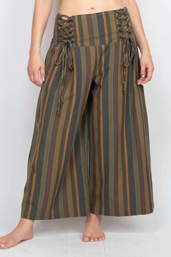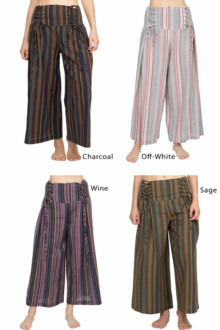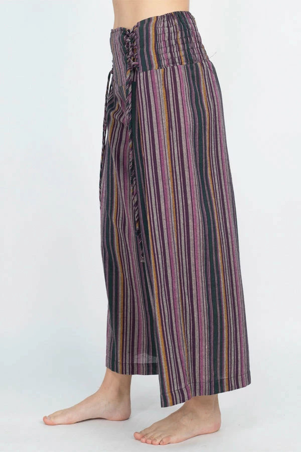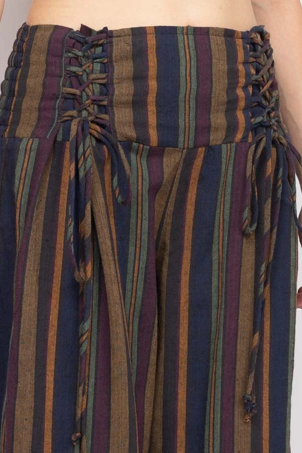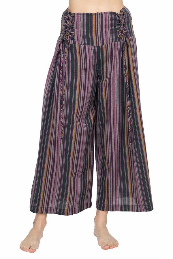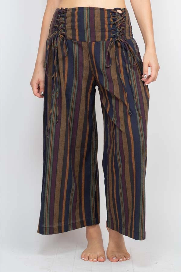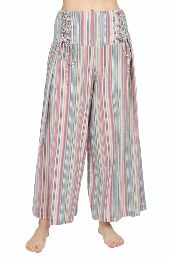 These pants are made from our favorite made in Nepal striped cotton, with an easy fit and an adjustable lace-up front waistband. The back waist is elastic for easy on and off. The legs are cut wide with a cute cropped ankle length perfect for wearing with sandals. Pair with our Butterfly Moonchild top for a day to night look.