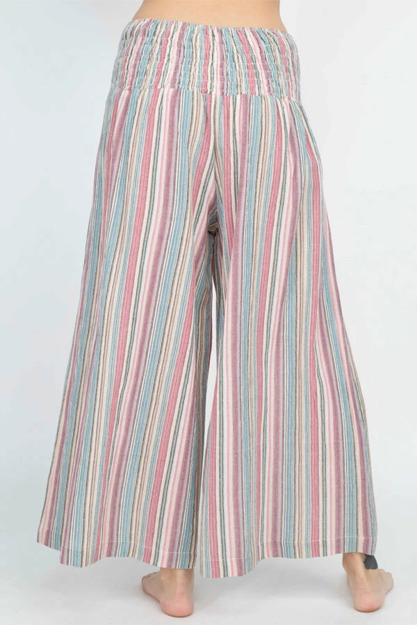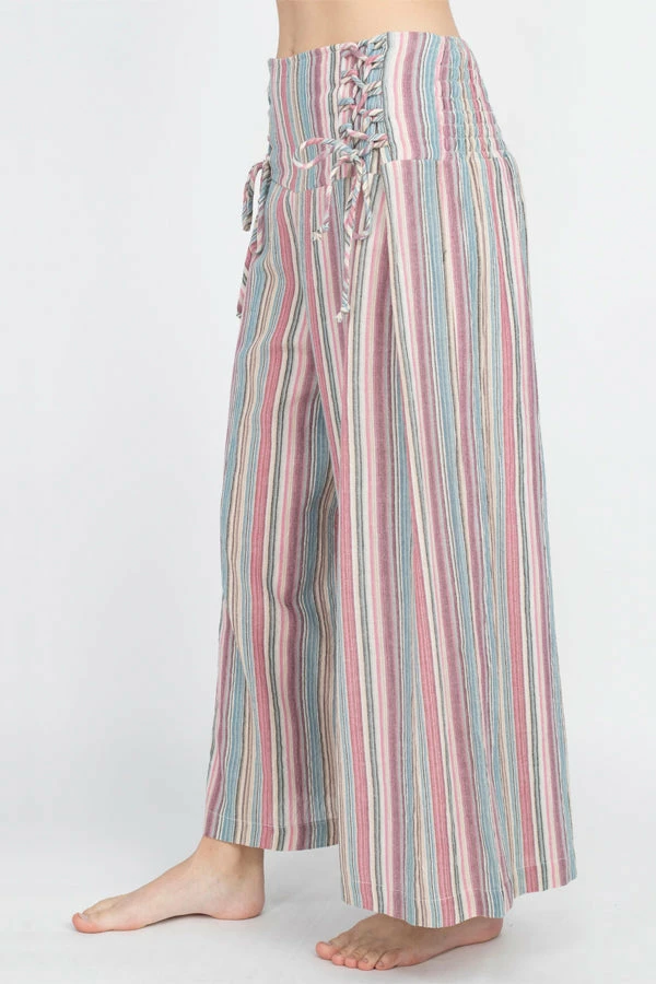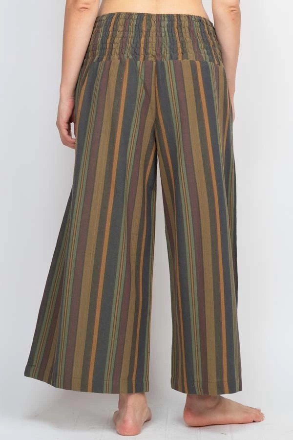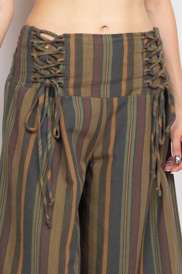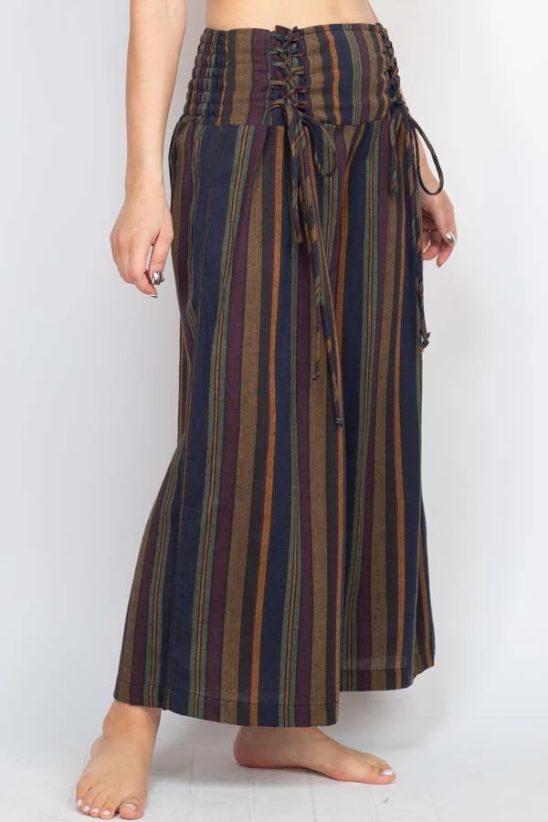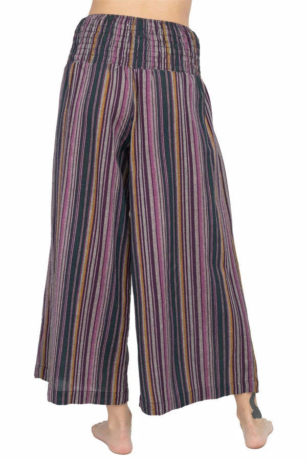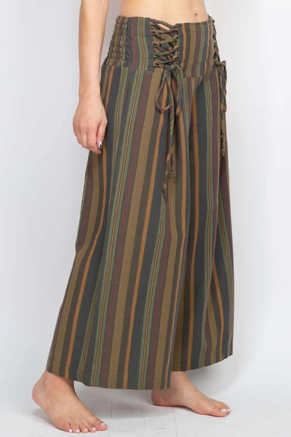 These pants are made from our favorite made in Nepal striped cotton, with an easy fit and an adjustable lace-up front waistband. The back waist is elastic for easy on and off. The legs are cut wide with a cute cropped ankle length perfect for wearing with sandals. Pair with our Butterfly Moonchild top for a day to night look.