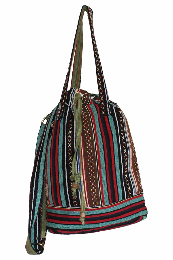 Constructed of cotton canvas this bag is fully lined with drawstring for closure. Features a adjustable main strap and a mini shoulder strap.