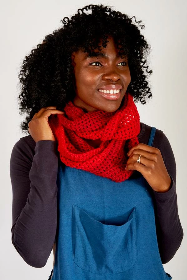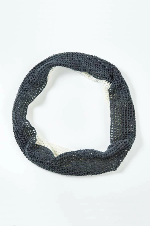 Our hand crocheted infinity scarf is hand crocheted in a two tone design to make it look a little like you’ve layered two scarves. The stitch is a little loose to make the scarf warm and soft but not hot and heavy. The colors are tonal so that it coordinates with many outfits.