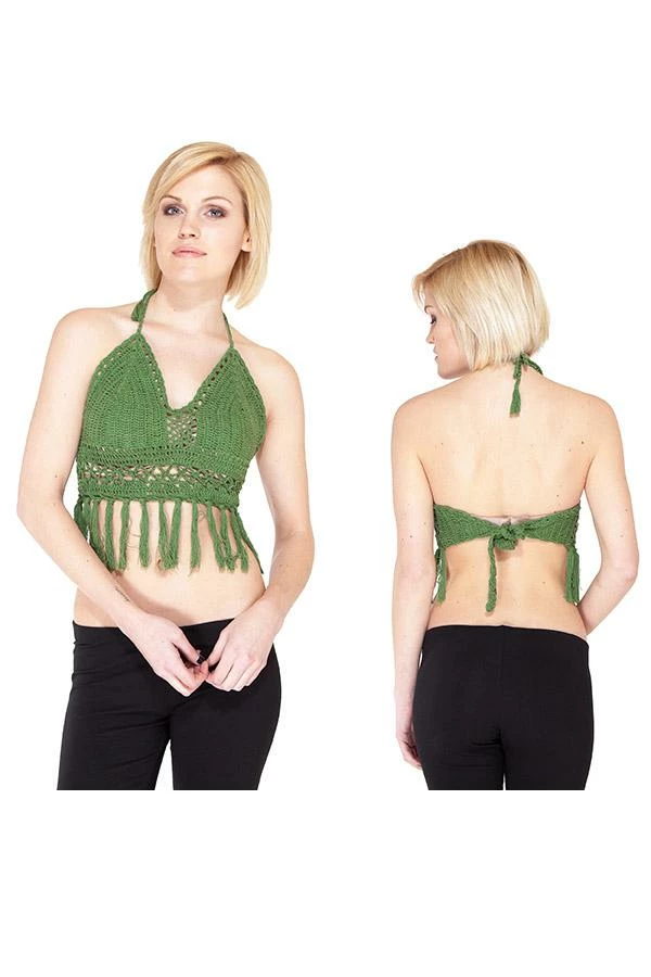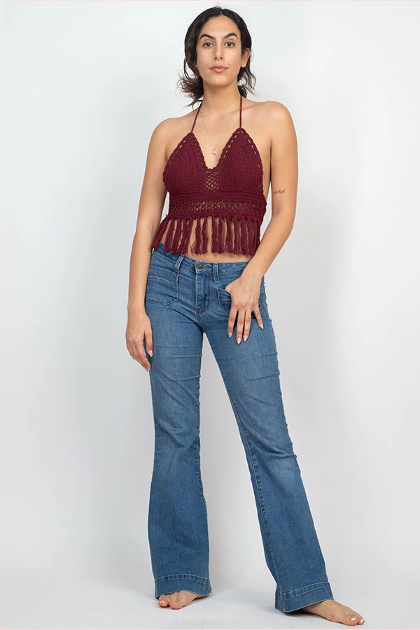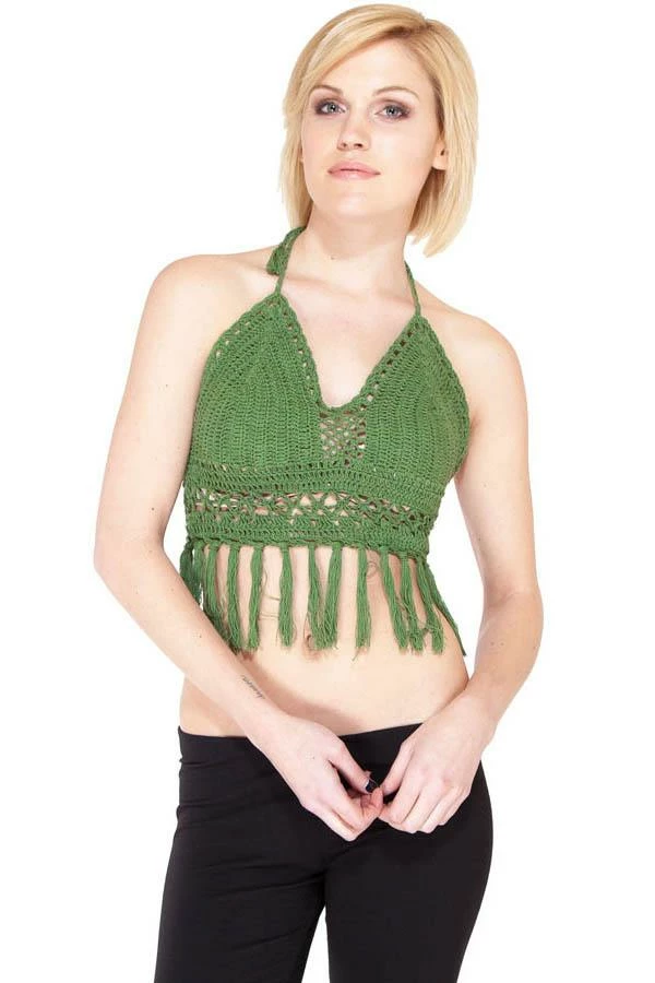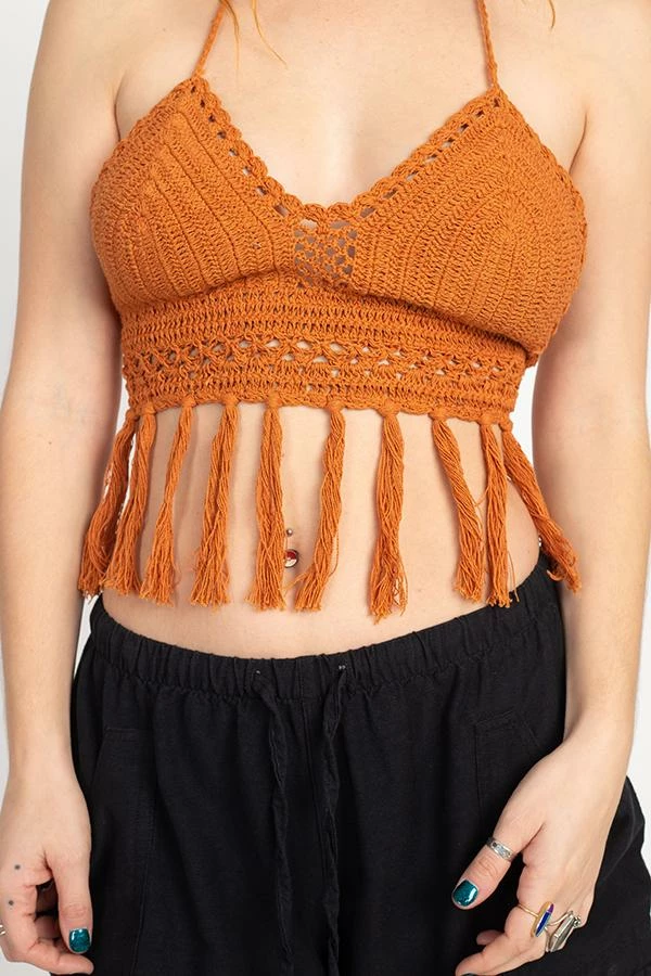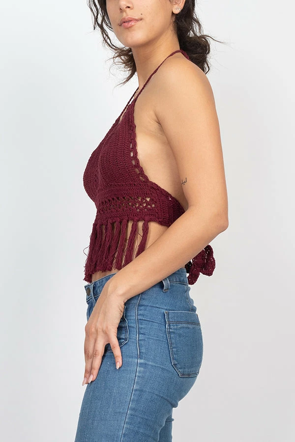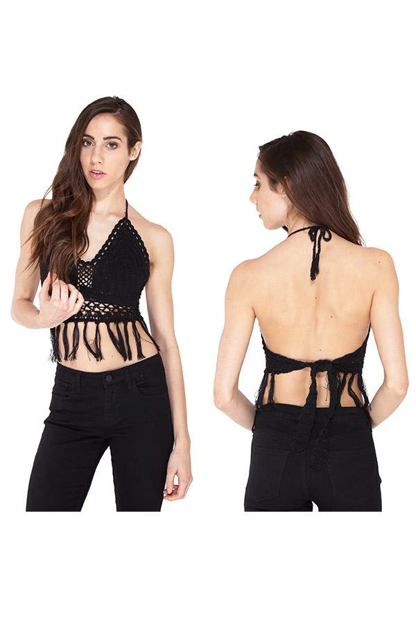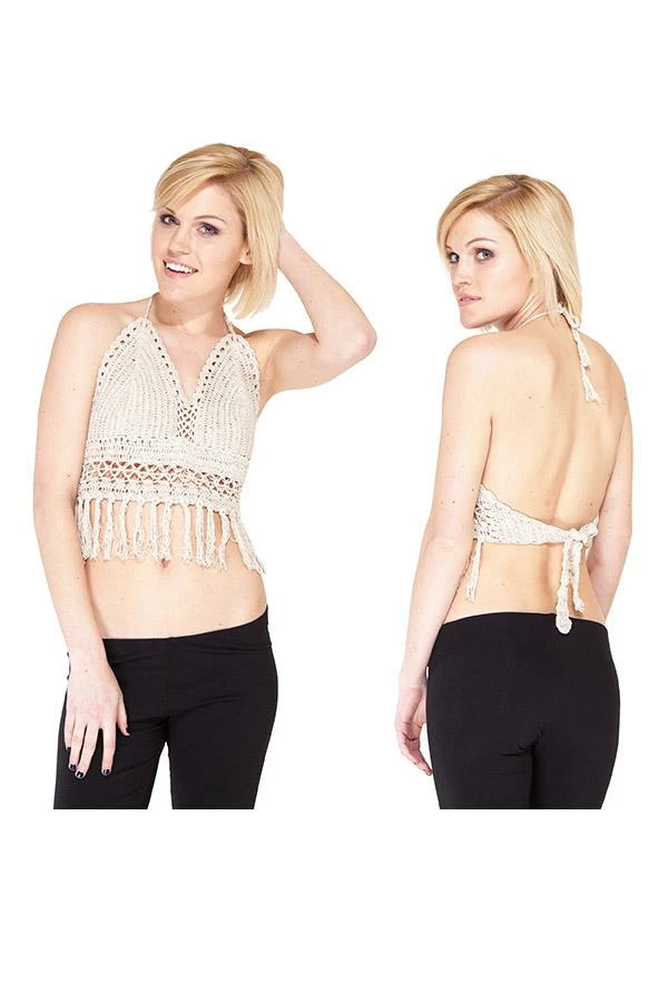 Add some funk to your summer style with the crochet fringe top. Made of 100% cotton, this top is soft, light, and durable, keeping you cool and comfortable all summer long. Ties at the neck and back allow you to adjust the top to your perfect fit. With fringe flowing freely along the bottom, this top can dress up your favorite jeans or complete your bikini look for a stylish day at the beach.