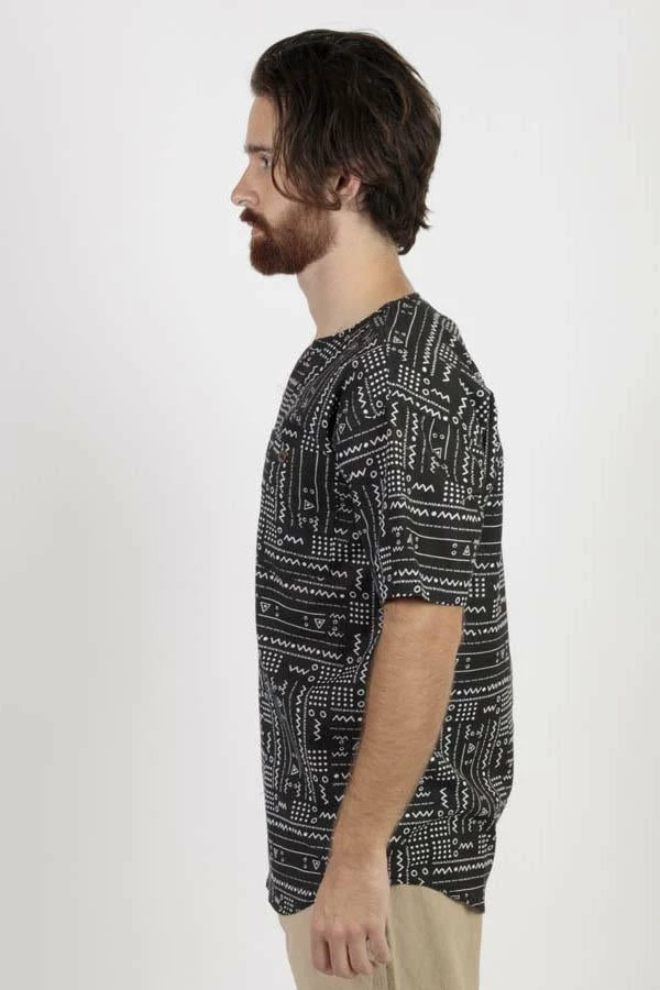 Comfort and style join forces to bring casual wear that will look great at the party and in the office. The simple collar and breast pocket add a professional sleekness while the open v-neck adds a bold touch that everyone will love. A relaxed fit with light fabric that is soft and breathable keeps you comfortable all day. Tribal artwork adds a creative detail that makes you stand out, so you can feel cool every time you wear this.
