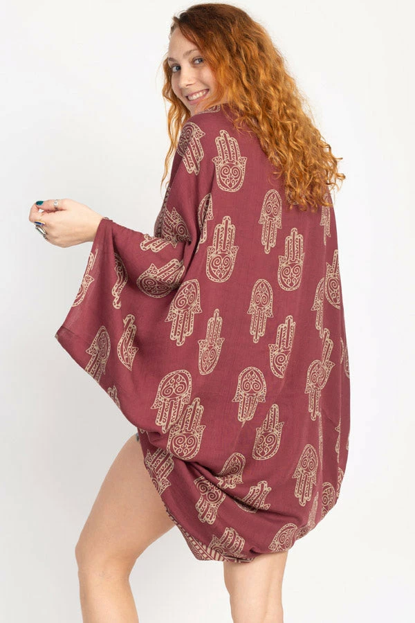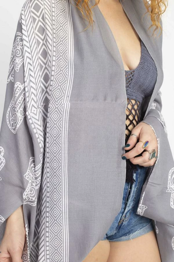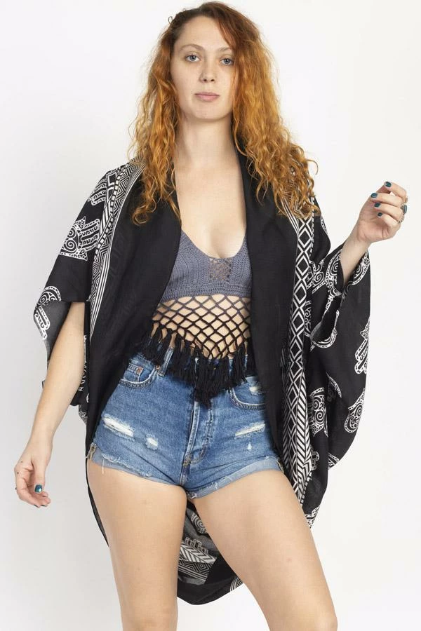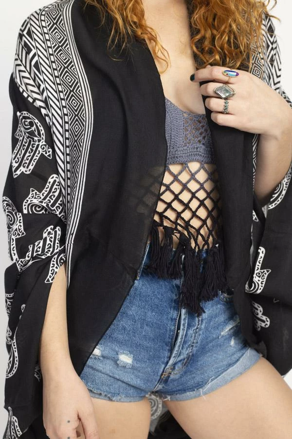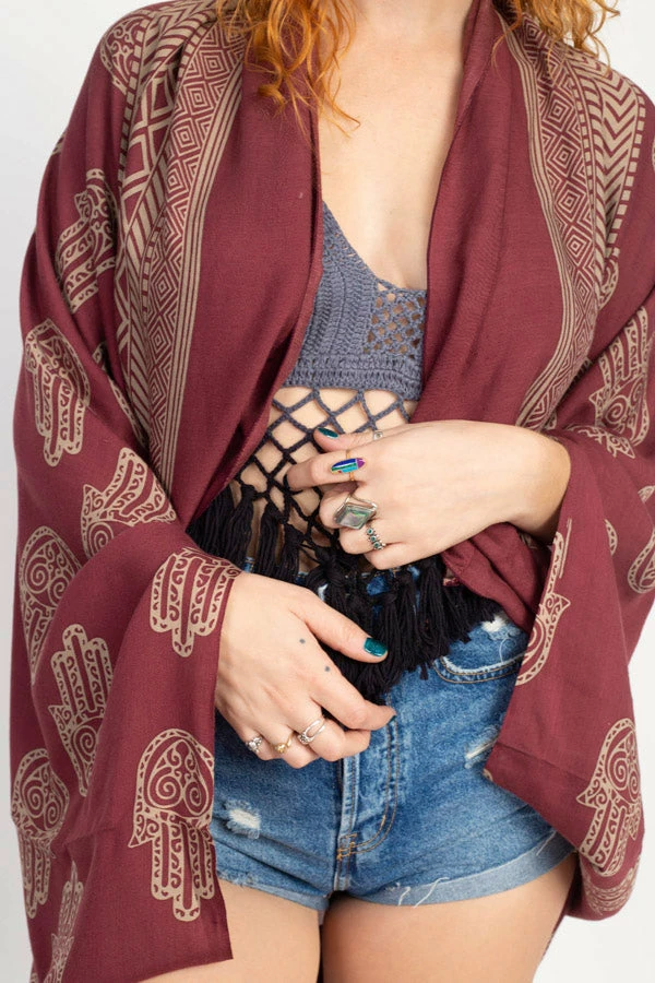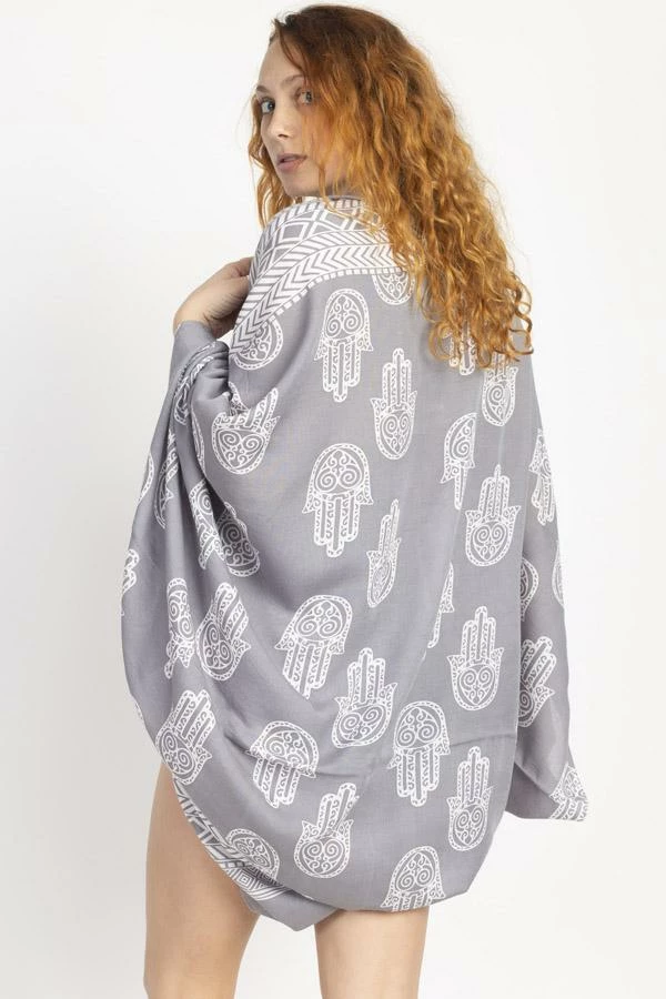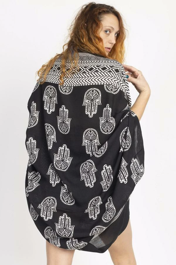 Cocoon yourself in this lovely soft wrap, printed with our favorite hamsa design. It looks lovely with any of your favorite outfits, or as a beach coverup. It also makes a wonderful gift as its easy fit works with many different body types and sizes.