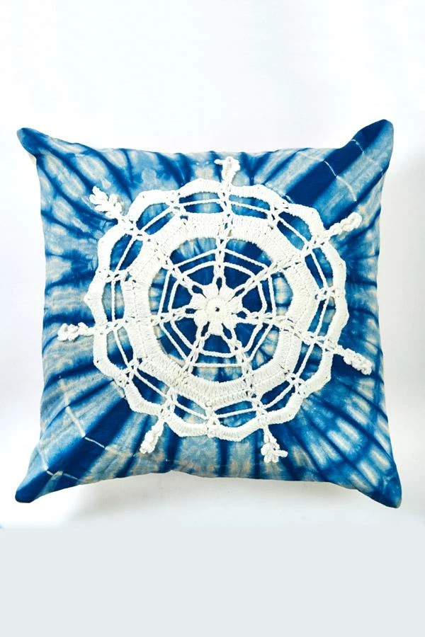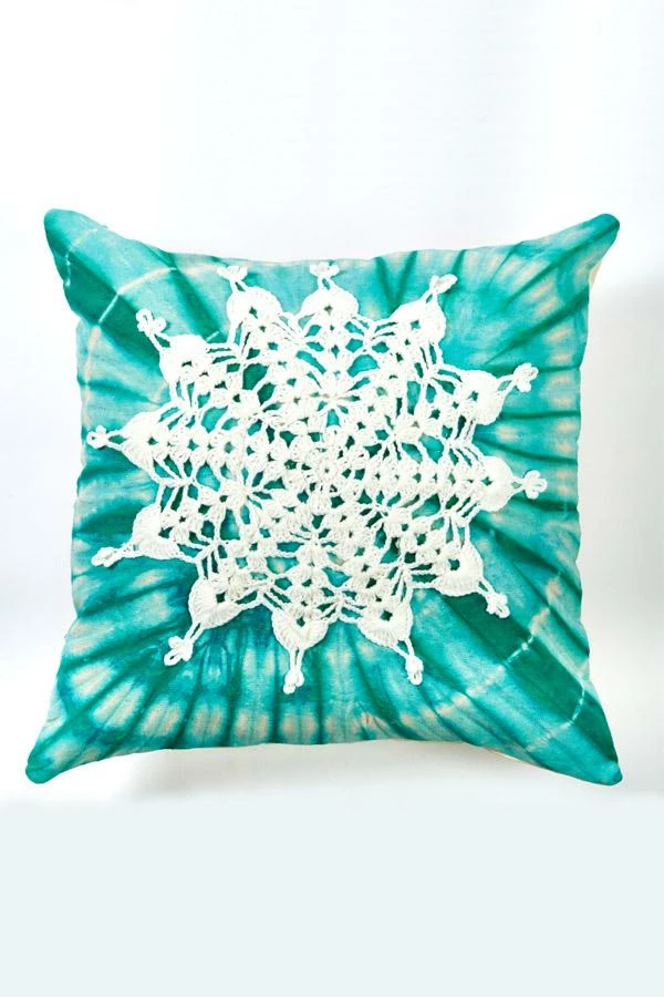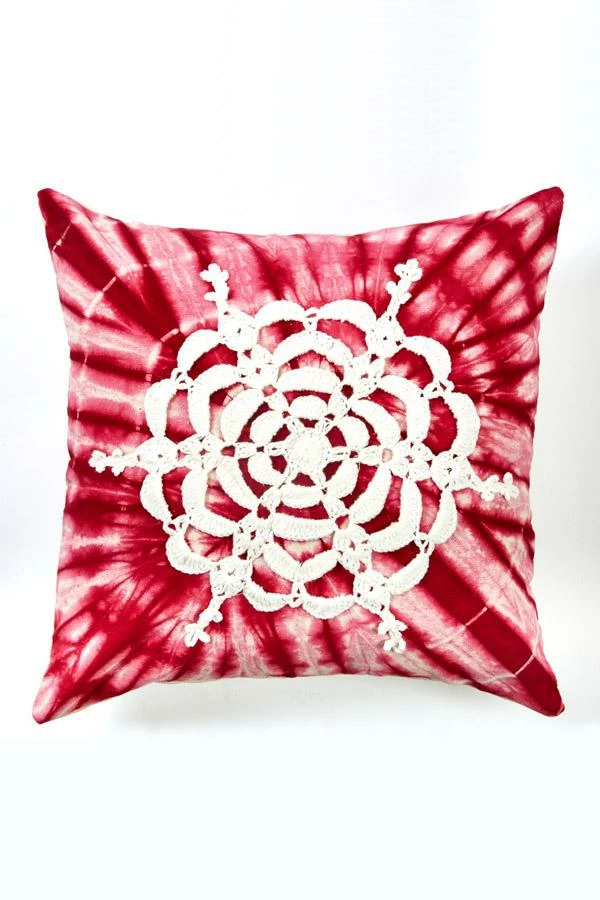 Our mandala snowflake pillow is hand tie-dyed and decorated with a hand crocheted snowflake mandala. The fabric is 100% cotton, and the back is closed with carved coconut shell buttons. The filling is not included with this pillow cover, we recommend either using this to recover one of your current throw pillows or to purchase a new pillow insert. Order a 20 inch x 20 inch insert in your preferred filling for nice filled look for these 18 inch x 18 inch covers, we like down alternative filling.