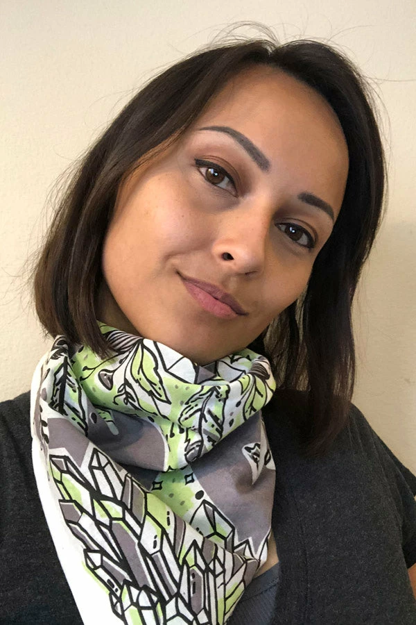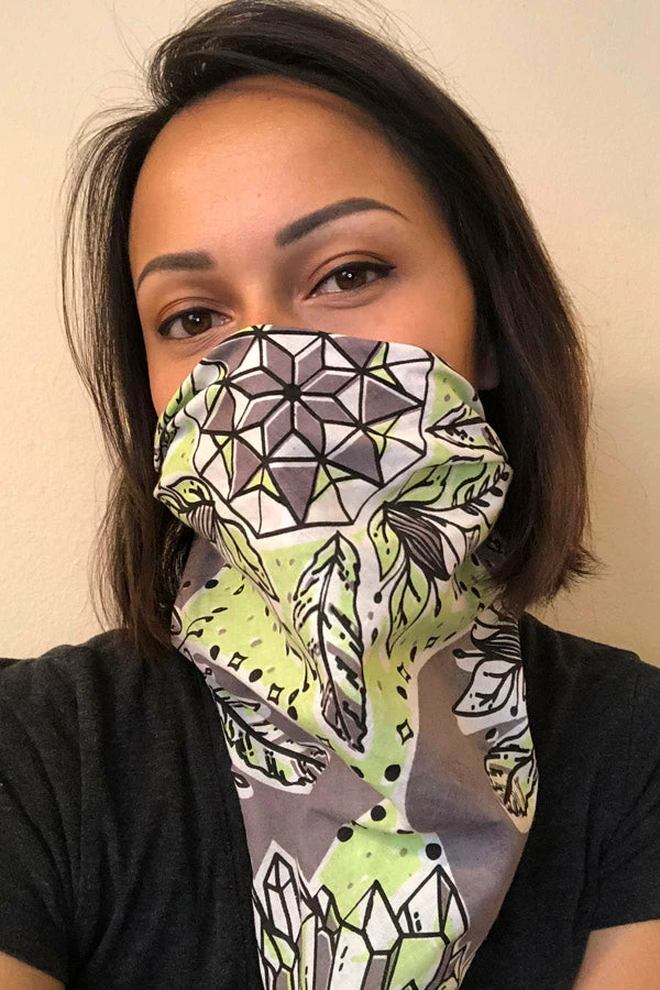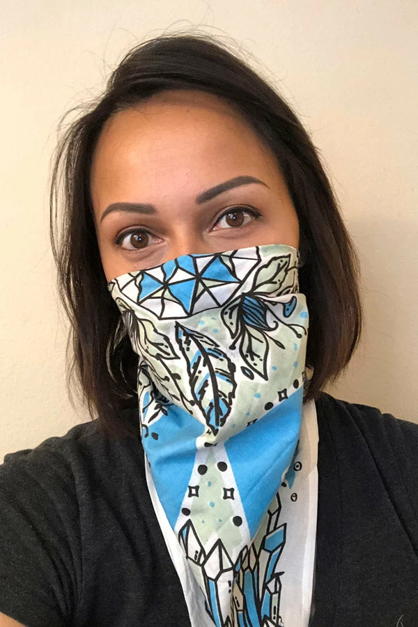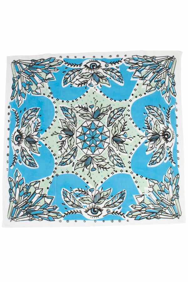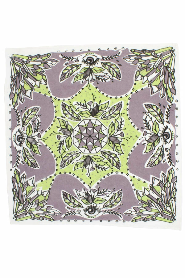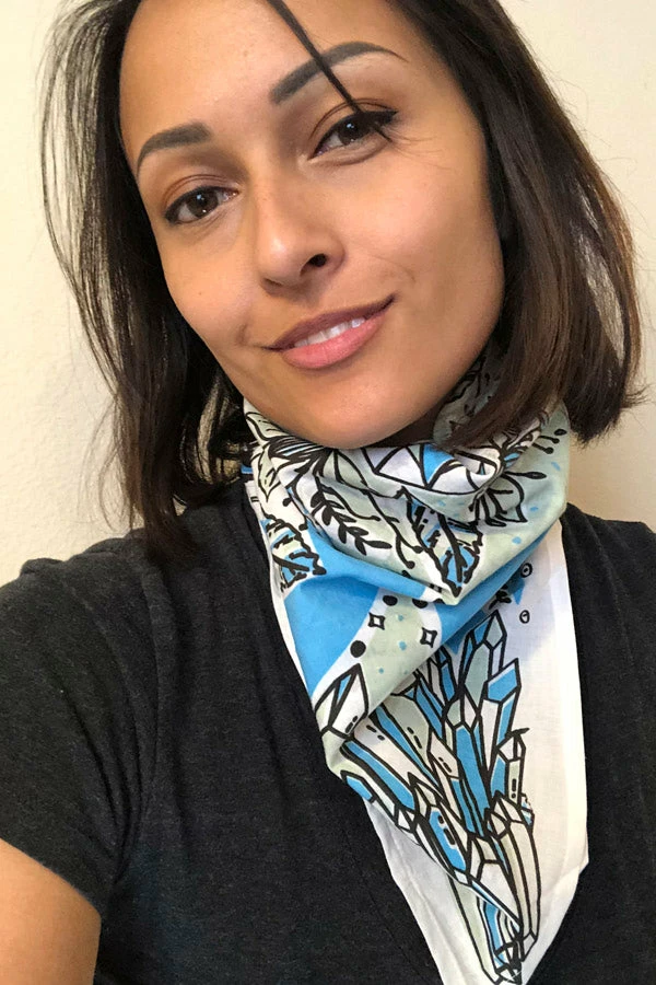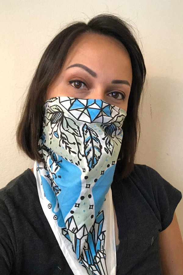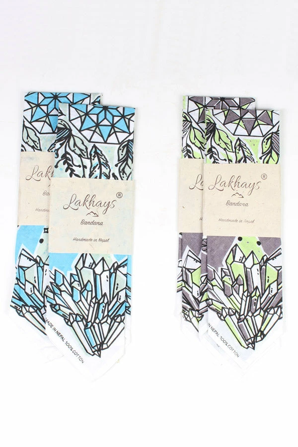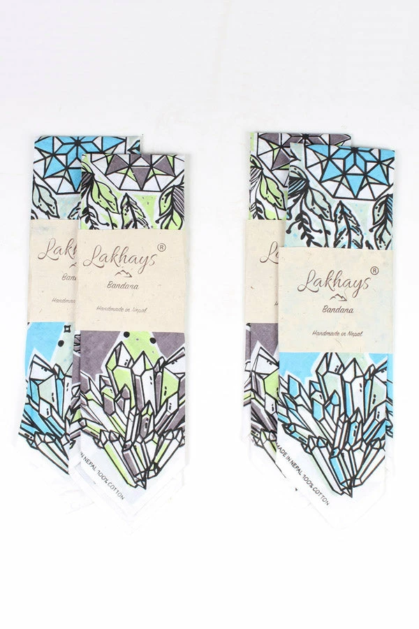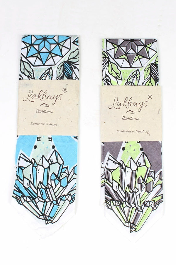 Our unique bandanas make a great gift or a small treat for yourself. These are hand printed in Nepal with fantastical healing crystals and feathers to help your heart fly. Wear as a headband, to protect your throat from desert dust, or get two and tie them together to make a halter top. The fabric is a thin cotton voile for easy knotting.