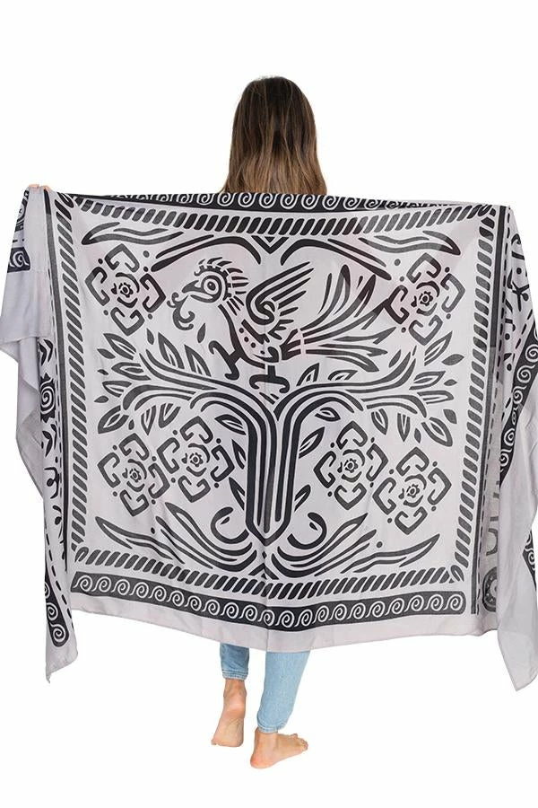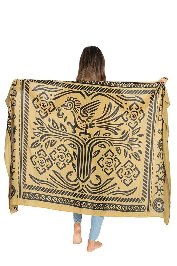 Our packable travel scarf is light, fun, and a great accessory to expand your travel wardrobe. This scarf has a pattern is based on an ancient Mayan tree of life carving. Wear it as a scarf or sarong, wrap it into a cute dress, tie it as a top, use it as a beach blanket, shade your head while hiking, or use as a shoulder wrap for visiting temples and cultural sites. Fold it into our included drawstring bag and tuck it into your backpack or tote to have it handy whenever you need it.