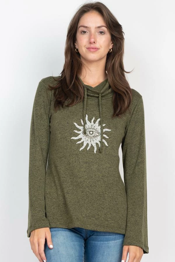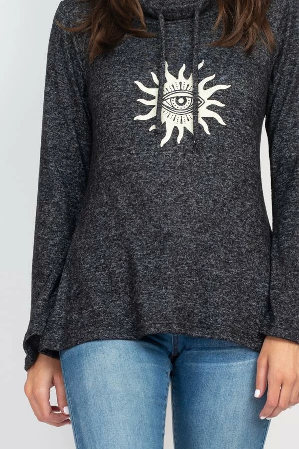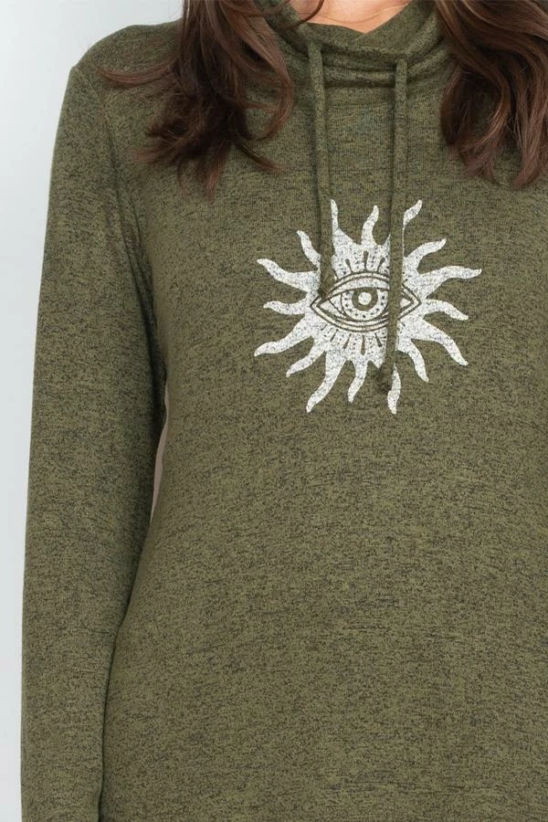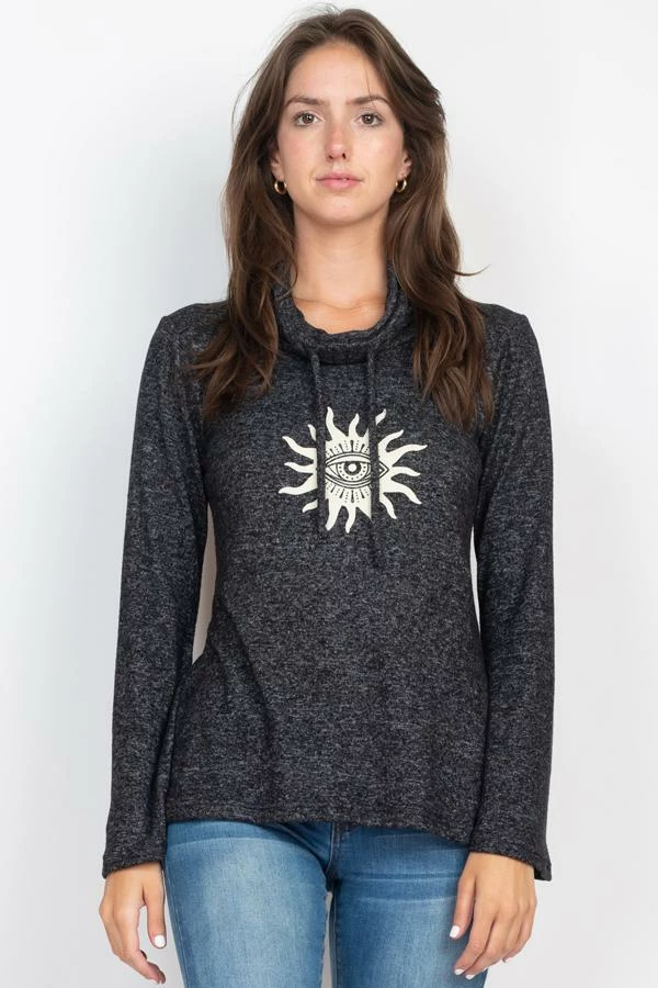 This light, soft, and cozy sweater is a must for every hippie girl’s wardrobe. It easly pair with lots of different bottoms for a soft and casual look or can pair this sweater with a similar bottom. The cozy and warm turtleneck keeps out the cold winds. A fun spirit Eye print adds a little boho flair.