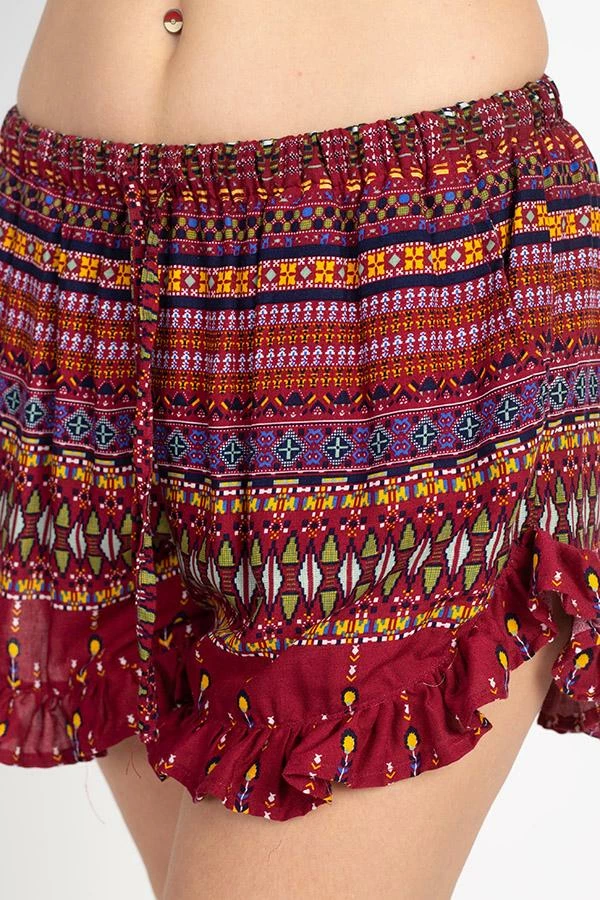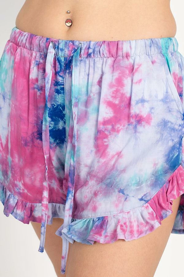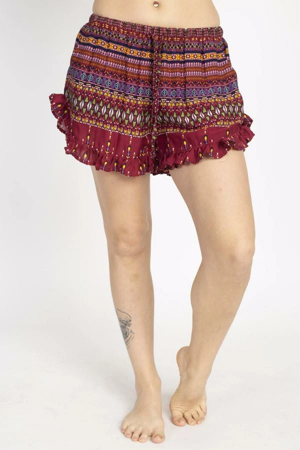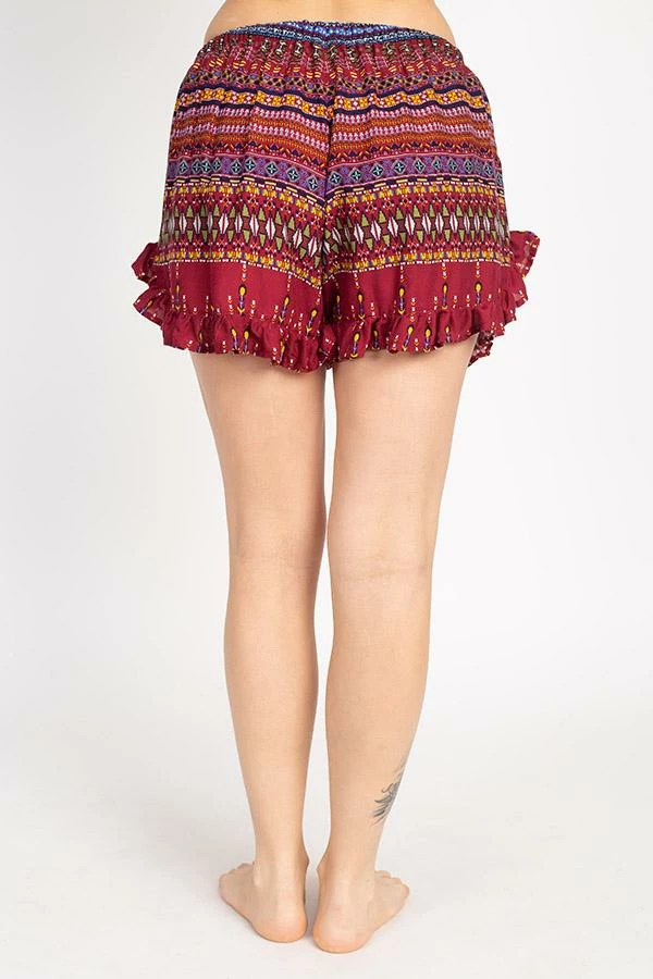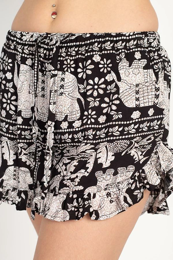 These light shorts are made of a cool and breezy printed fabric with an elastic waist and roomy pockets. The hem curves up at the sides and reveals a little for a flirty look without being too short. The ruffle gives a feminine detail to add a little romance.