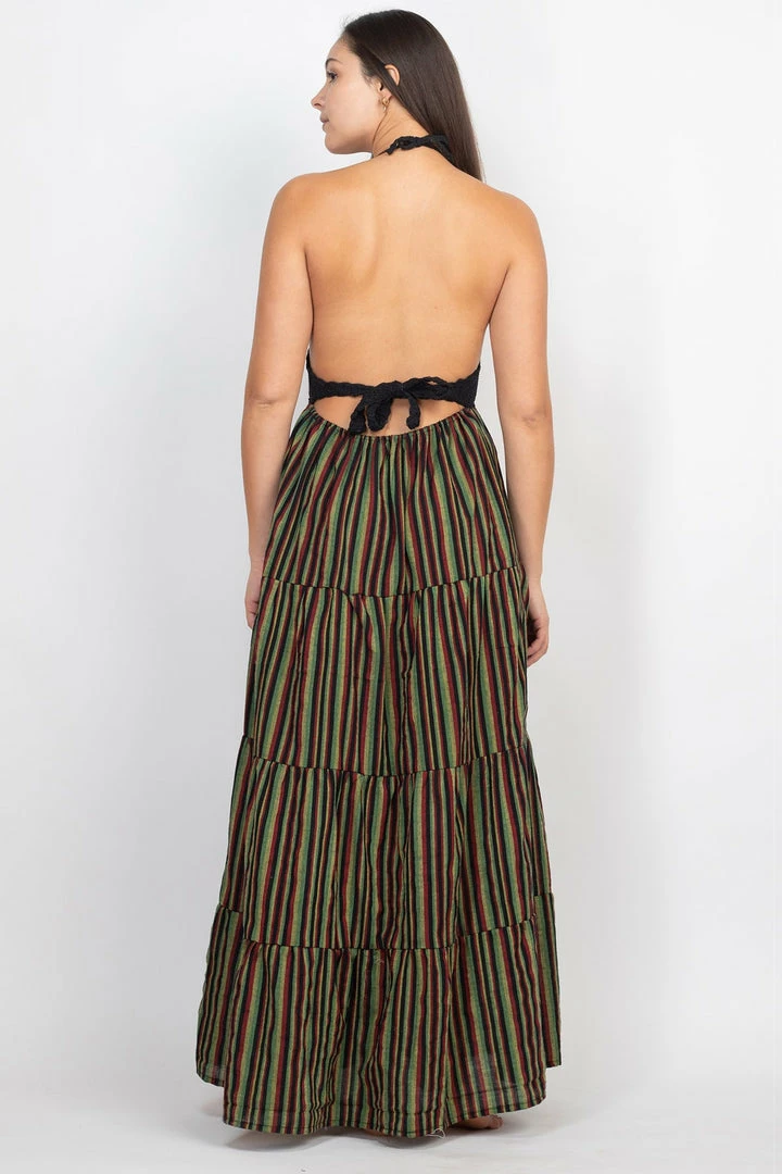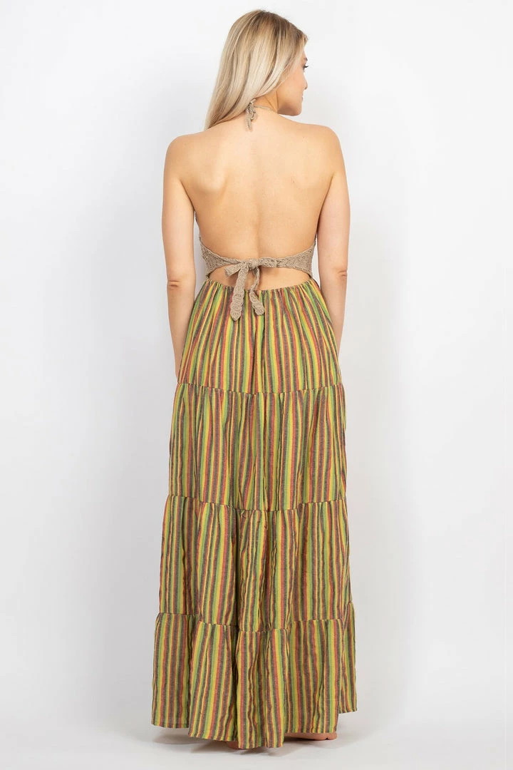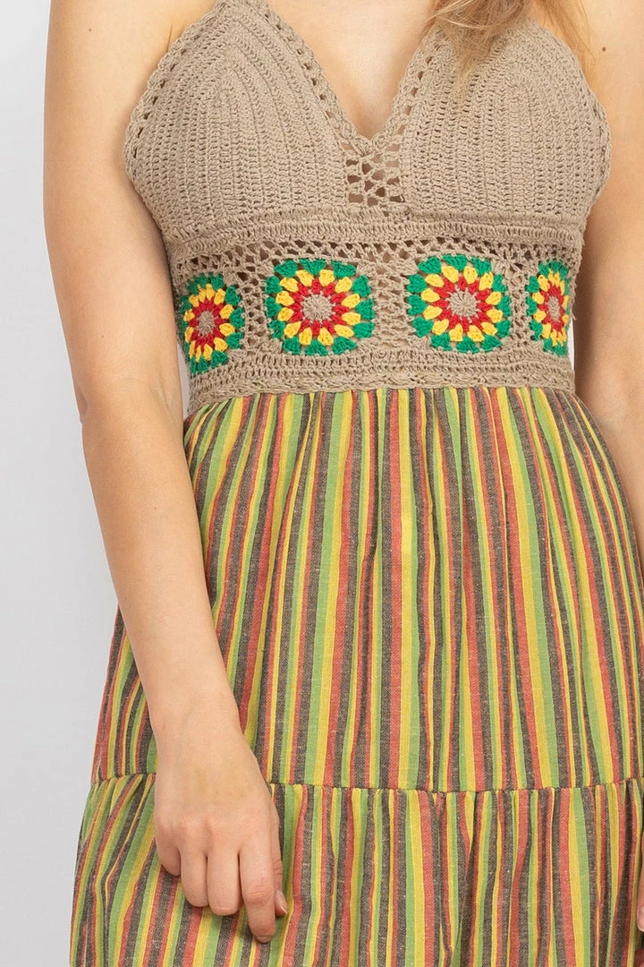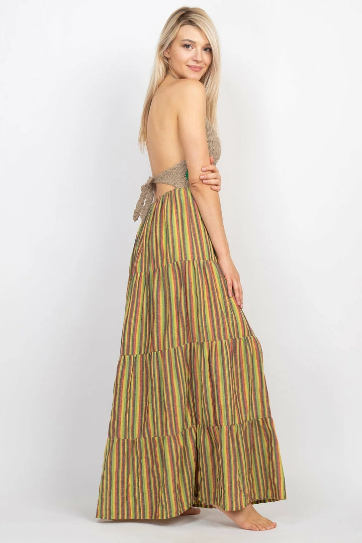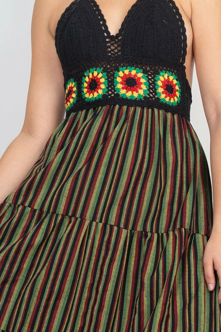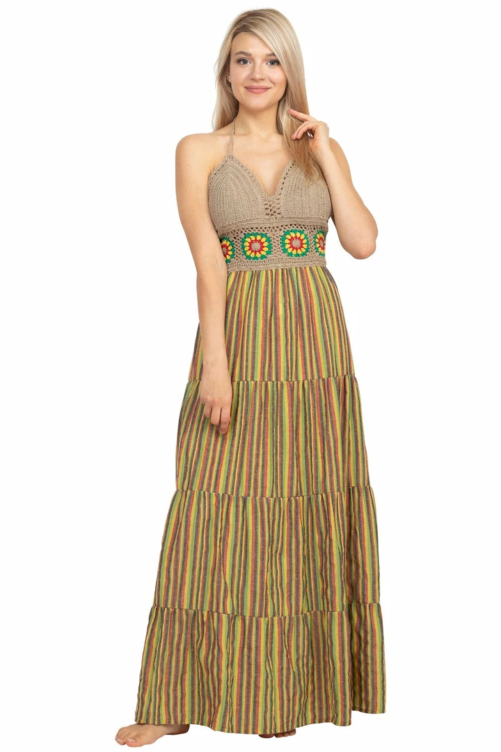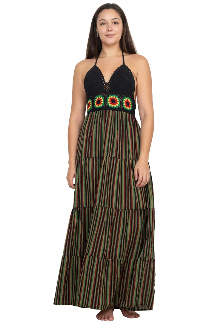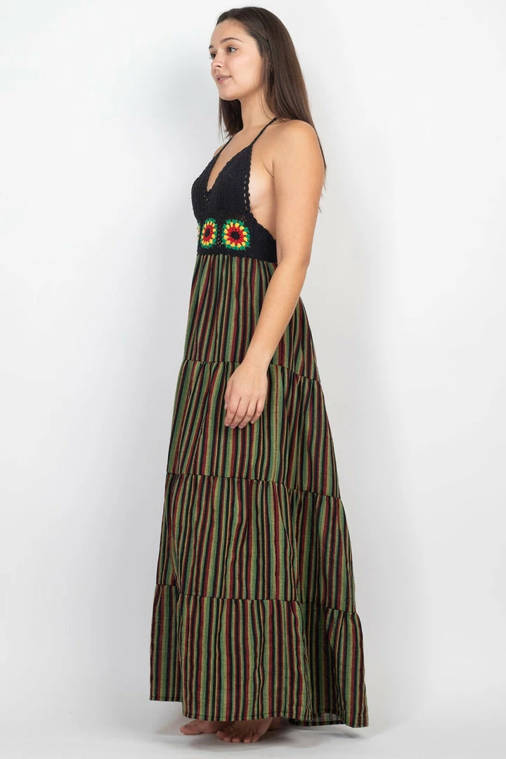 Rock summer style this season in our Rasta Crop-Top Stripe Maxi Dress. We custom weave this soft 100% cotton stripe fabric in Nepal, so this dress is guaranteed to be unique. The soft crocheted cotton ties at the neck and back allow you to adjust the top to your perfect fit. With a flower design and stylish straps along the sides, this top is sure to be the eye-catcher of your look.The long skirt give it a lot of swing and flow.