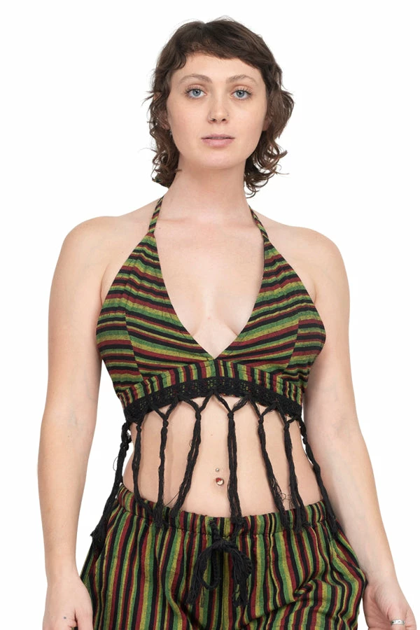 Go on a Rasta safari adventure with this Rasta Halter Top With Fringe. Made of 100% cotton, the fabric is soft and durable, keeping you comfortable all day long. Cotton lining adds extra security and comfort. With ties at the neck and back, you can adjust this top to have the perfect fit. The low cut V-neck is bold and bearing while the tasseled fringe is free and flowing. Pair it with your best sarong for a stylish day at the beach or wear with your favorite palazzo pants for an adventurous festival look.