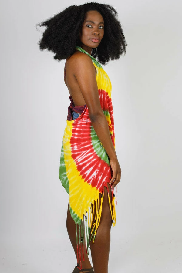 Flow with freedom in a swirl of color and comfort. Gentle fabric flows down at your sides, accenting your figure and adding a graceful flow to your step while beaded fringe dances and waves with each step. The bright swirls of color help you show off all your funky Rasta vibes so you will be the main attraction at your next neighborhood cookout or music festival. Pair with our other Rasta items for an even more powerful complete look.