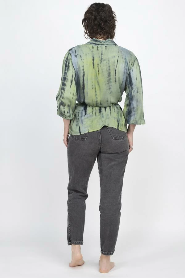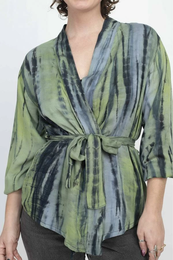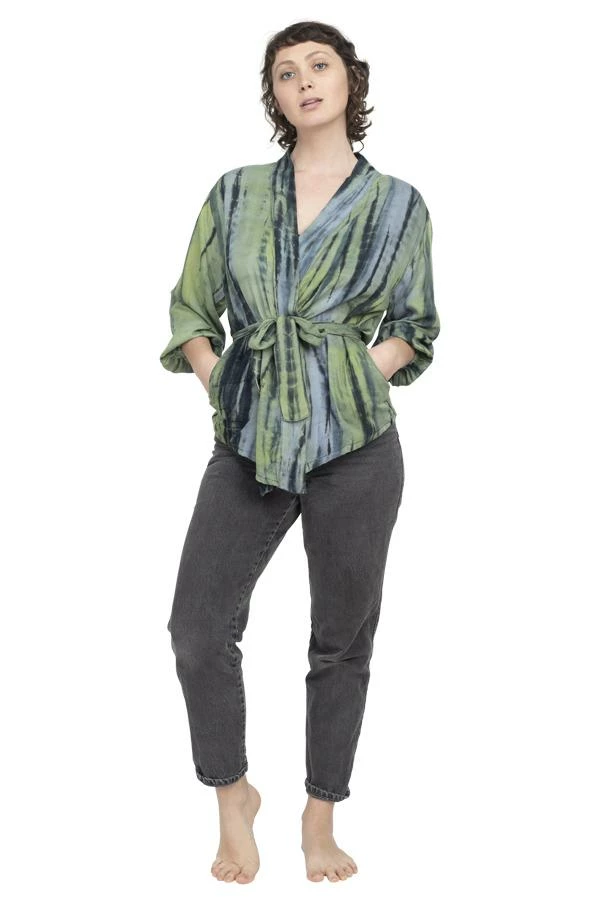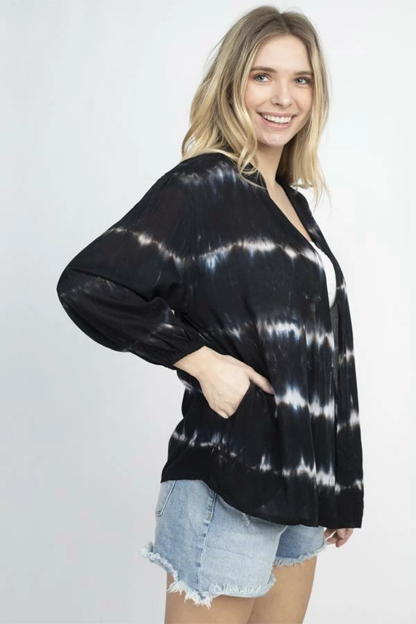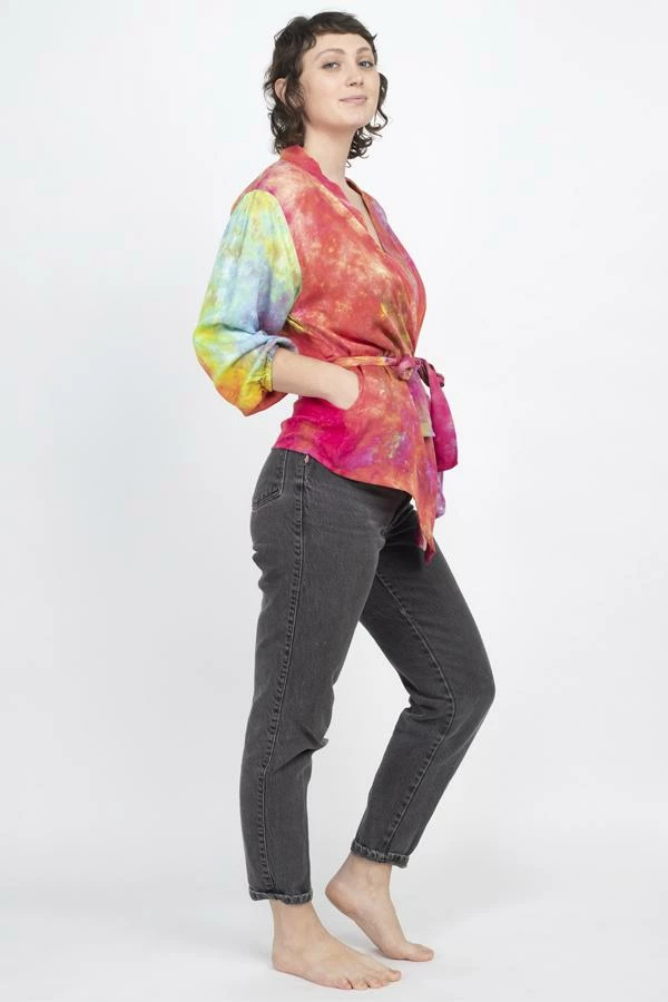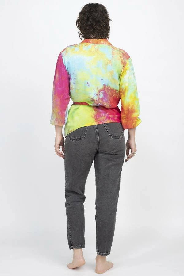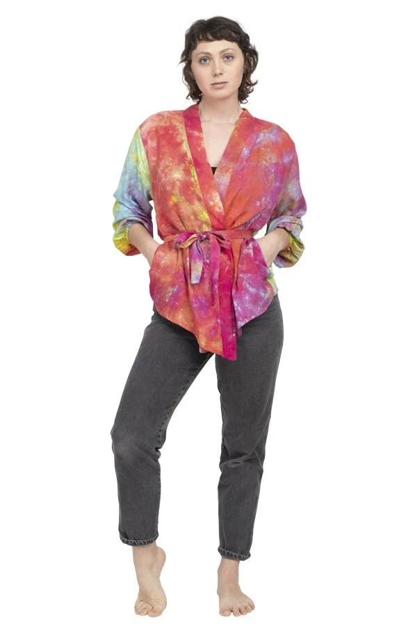 Meet the best of both worlds in this must-have tie-dye blazer. It has just the right combination of serious style and funky vibes to fit perfectly into any setting. The loose fit is comfy, cozy, and leaves room for layers or can tie it to keep you both comfortable, stylish and warm. This loose fitting rayon top is great for the summer. Loose and baggy this top works for the beach as a cover up. Pair this top with your natural or solid-toned work usual and bring good energy to the office.