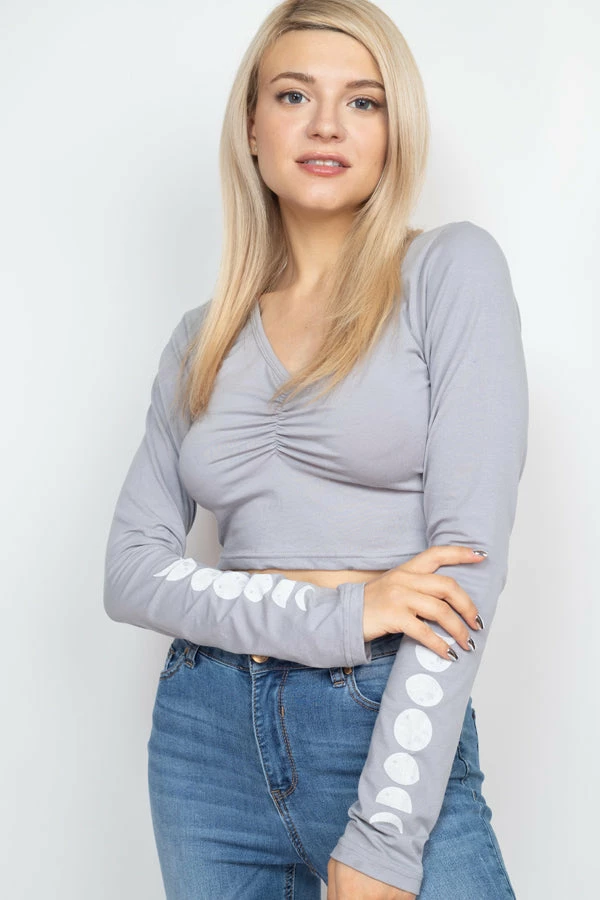 Easy fitting Moon Phases Ruched Top features a flattering scoop neckline and long sleeves. The top is made from a stretchy and soft organic cotton spandex blend. These tops will go with your favorite overalls or bottoms. It also works great as part of your yoga or dance wardrobe