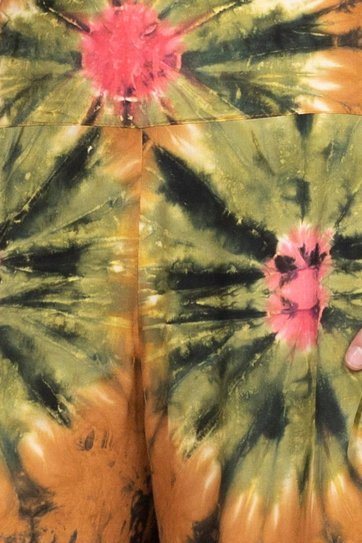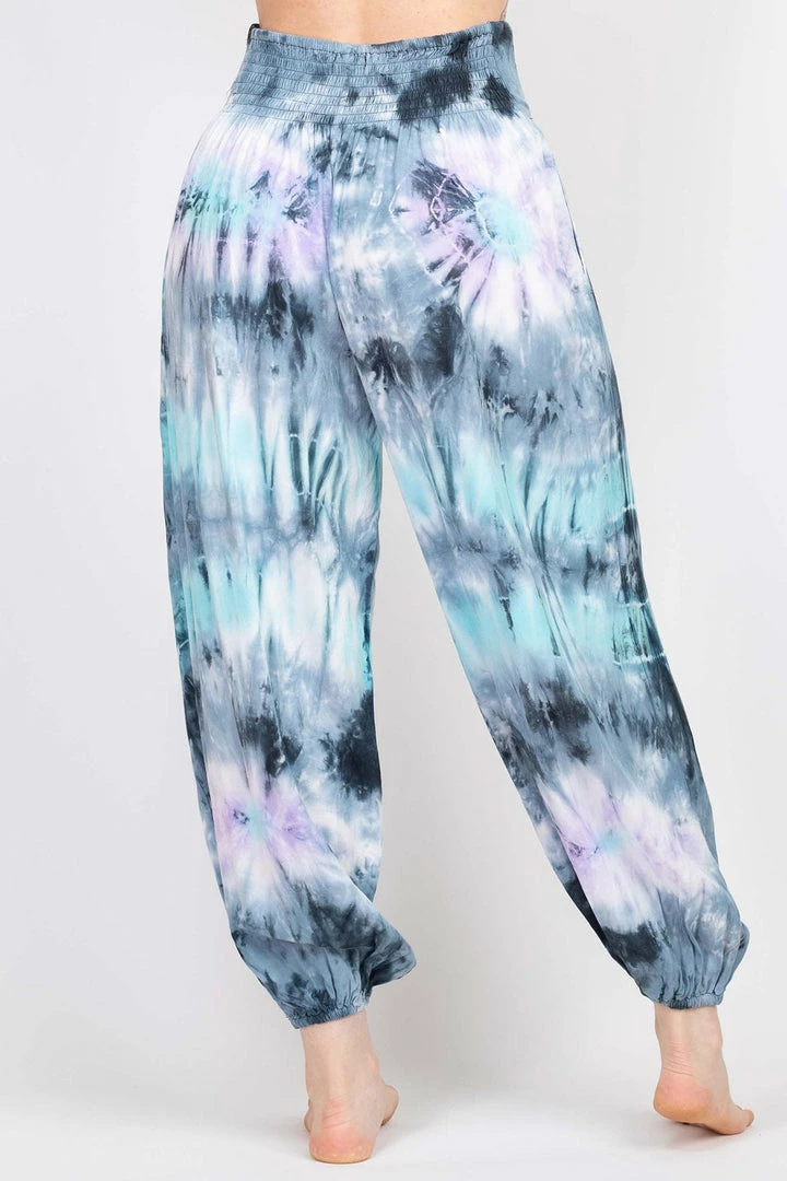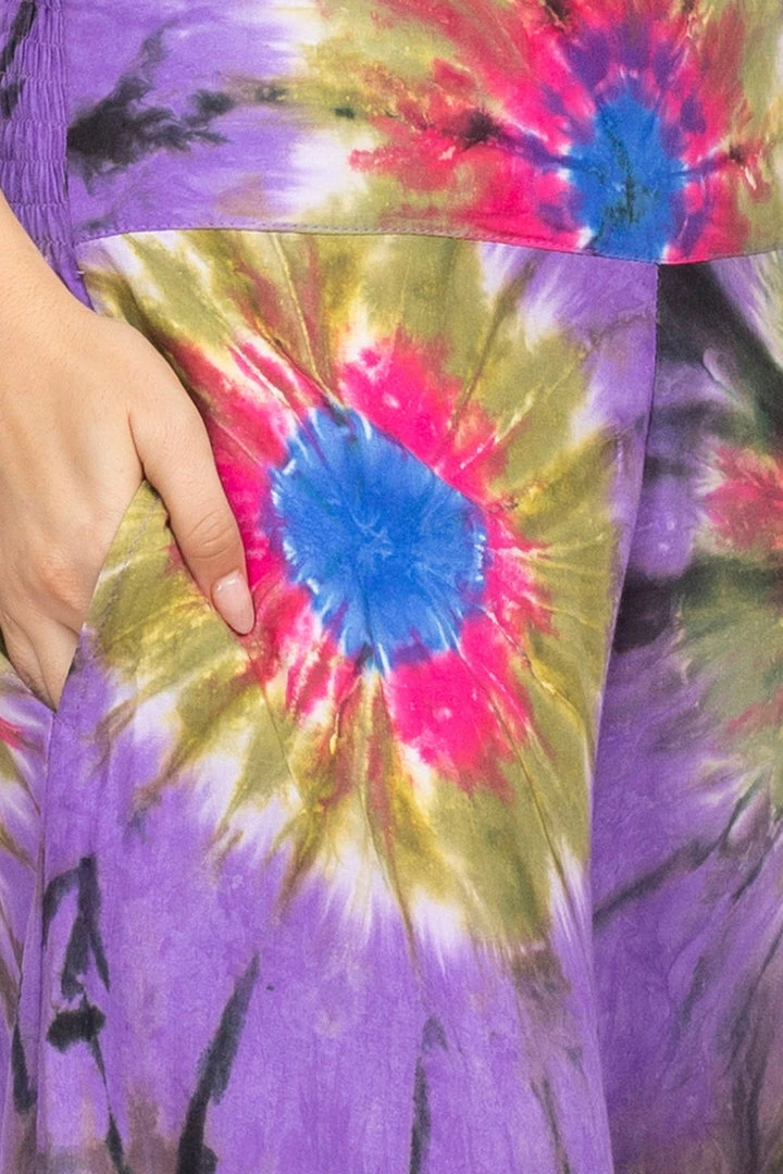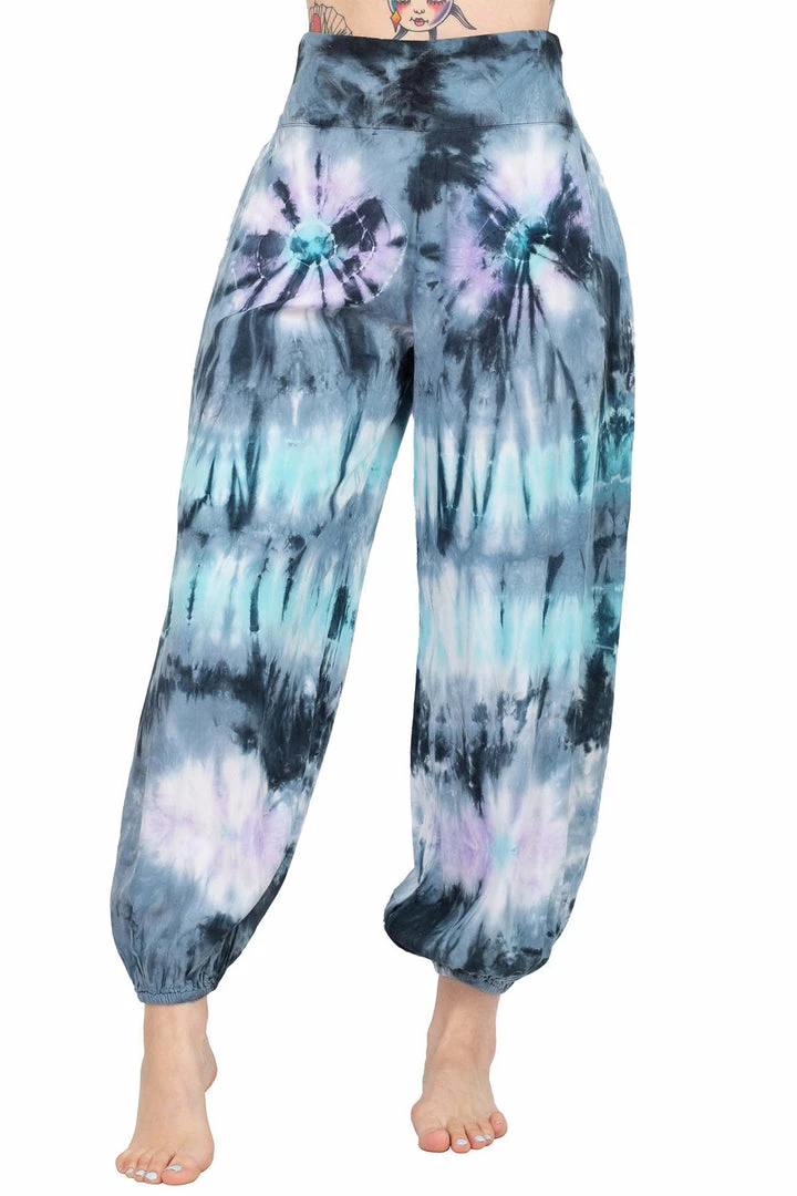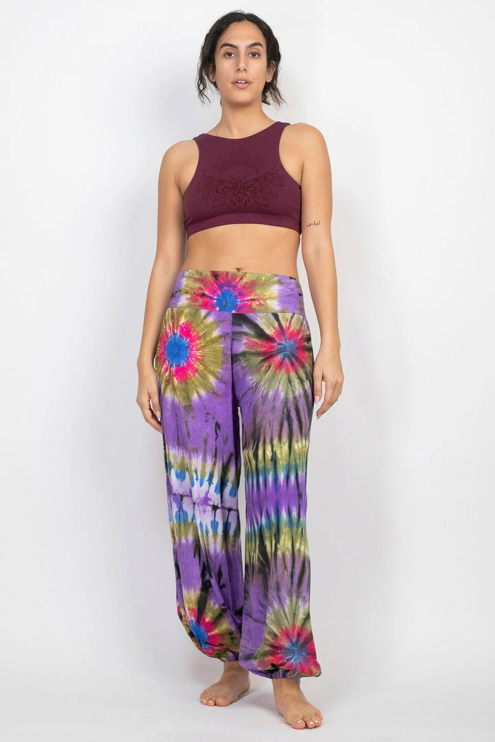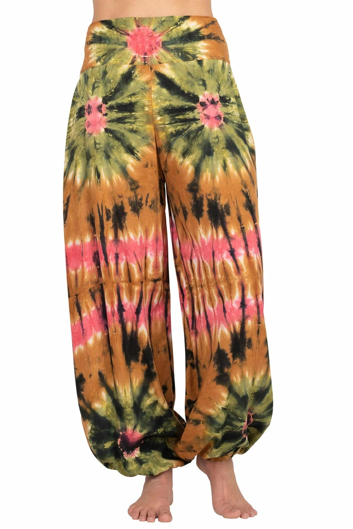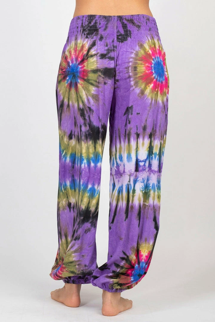The brilliant, unique tie dye of these pants will draw all the attention to you. They are almost neon, hand tie dyed in Bali for the perfect beach or party look. There are pockets for all your necessities, and an elastic back and ankles for an easy fit.