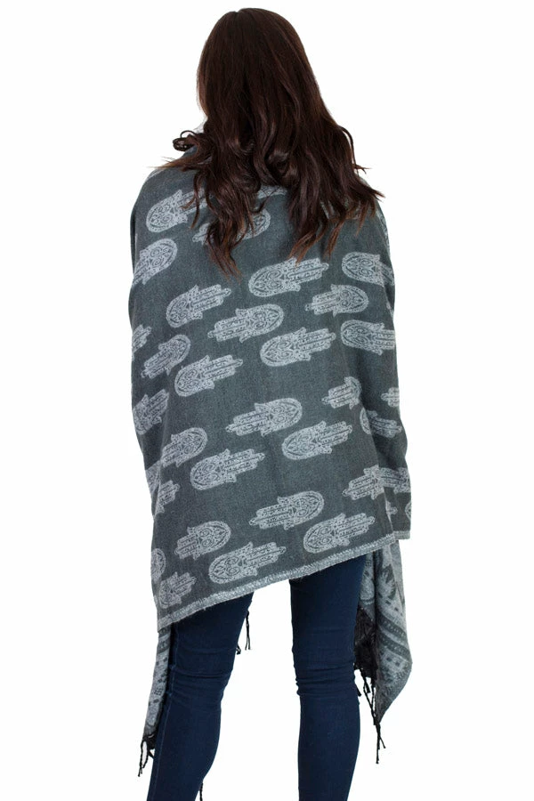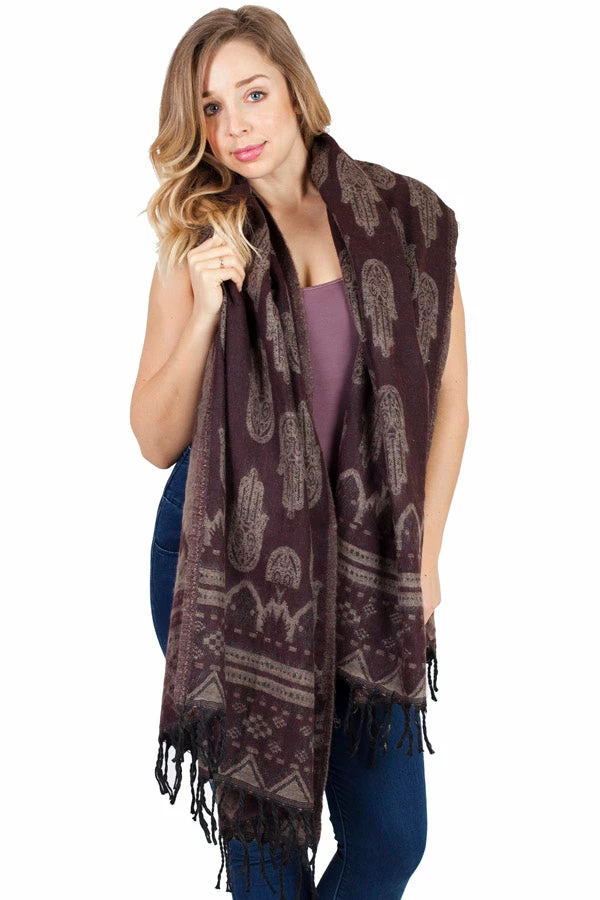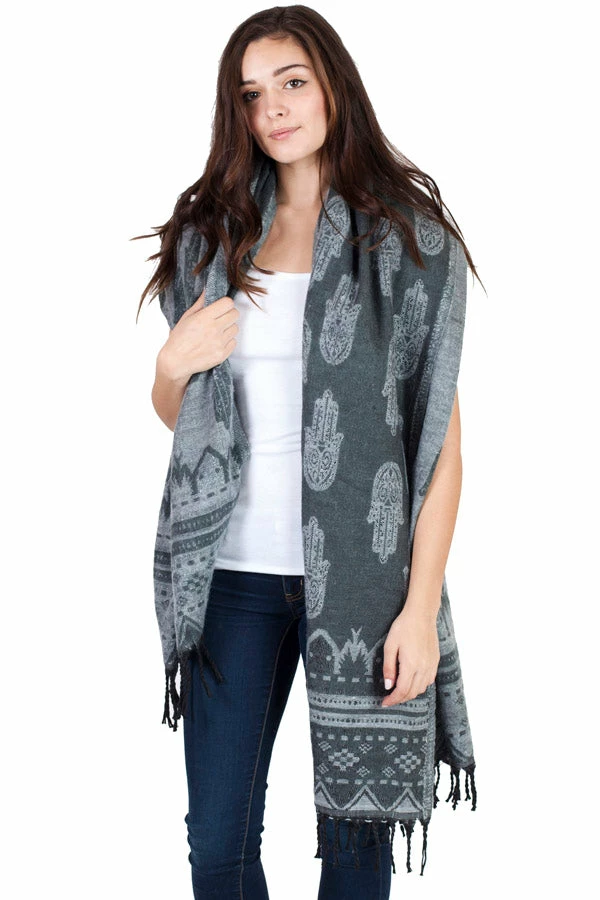 The hamsa is known as a symbol that brings protection and strength to women. This scarf adds the right amount of power to your look . Fringe waves on the ends like leaves swinging in the summer breeze. The fabric is soft keeping you comfortable and warm as you power through the day.