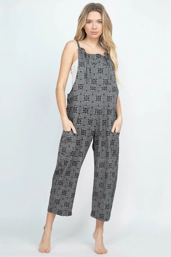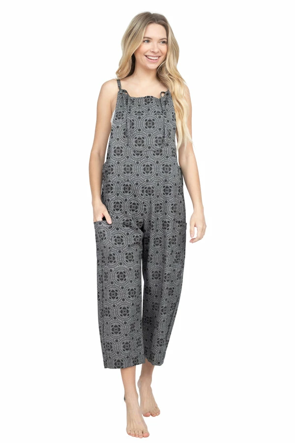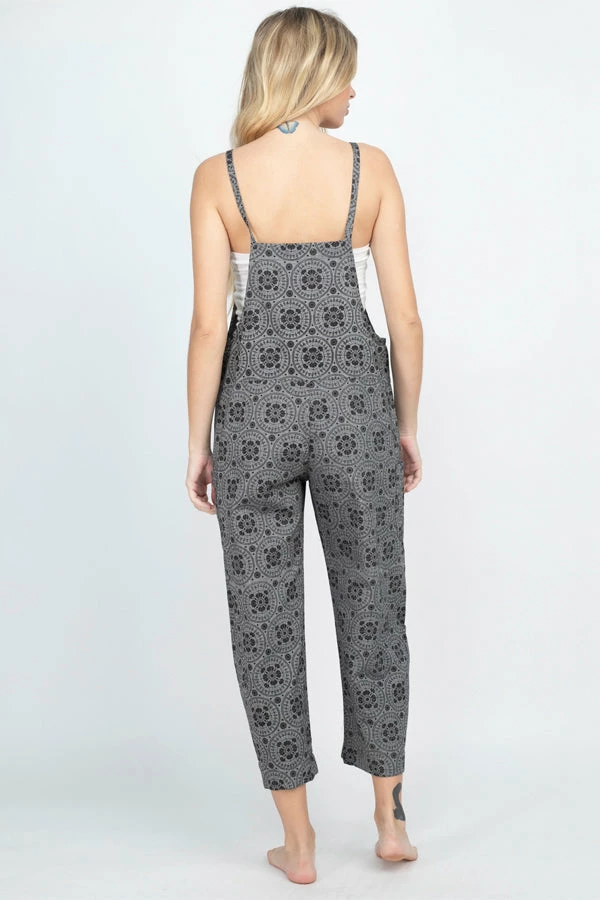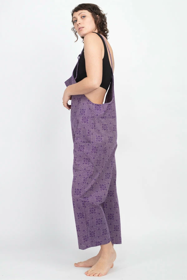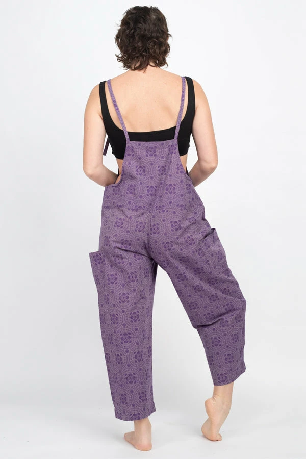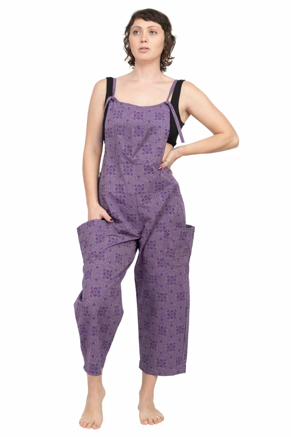 These fun Lotus Mandala overalls are made from 100% Cotton. The straps are a simple tie so that you can adjust them easily to fit any length torso. The side pockets are generously sized to fit all your necessities. The legs are wide and cropped at the ankle.