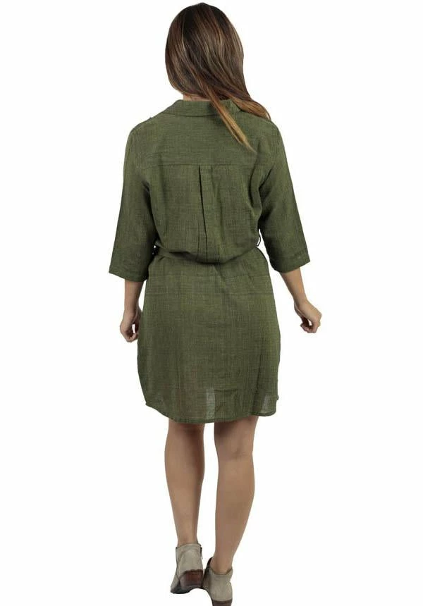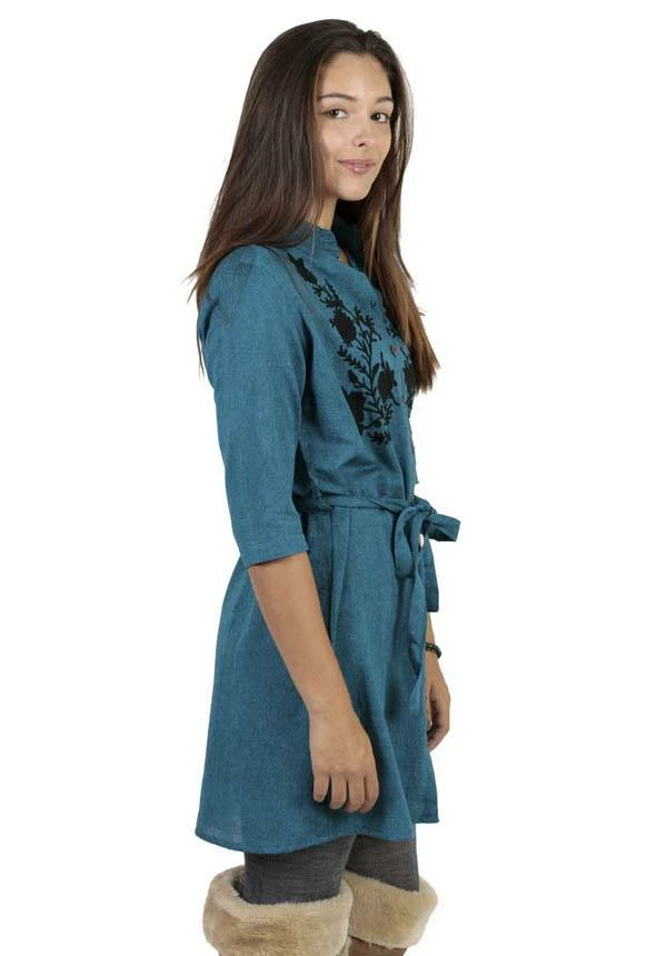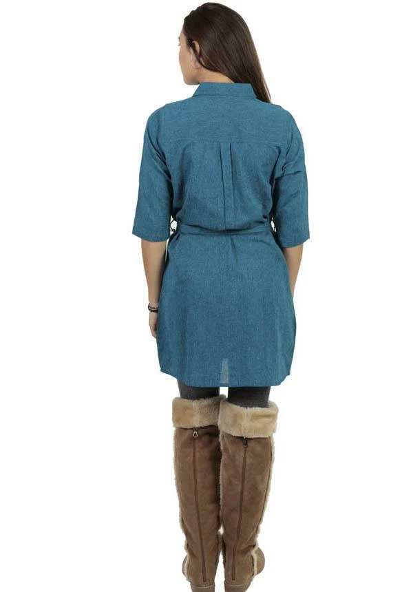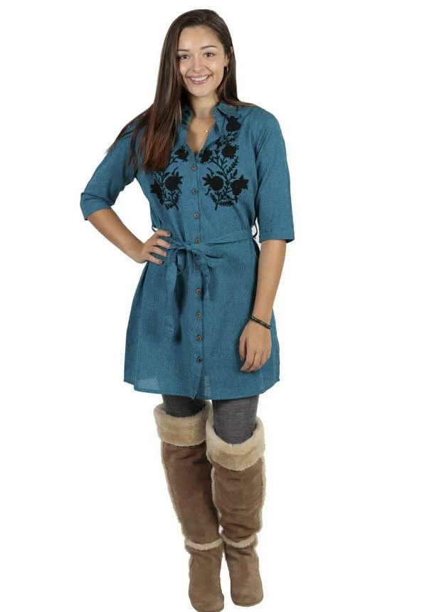 Look great and get down to business without the stiffness of starchy business wear. This professionally casual shirt dress has everything you need to look great for work. The stylish collar complements the waist-ties and cuffable half-sleeves. Our two tone woven design with embroidered floral accents pairs well with jeans, leggings, or tights for a look that can go anywhere.