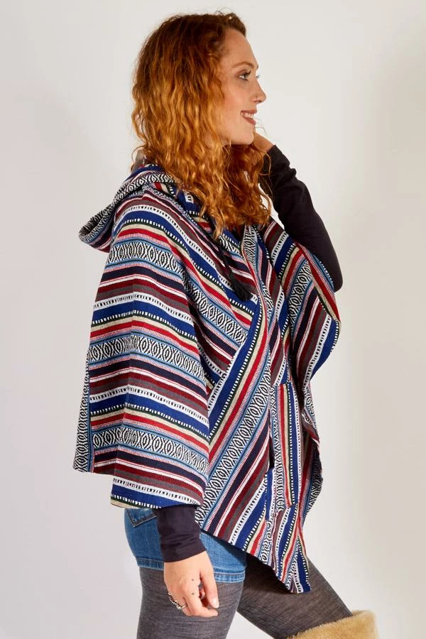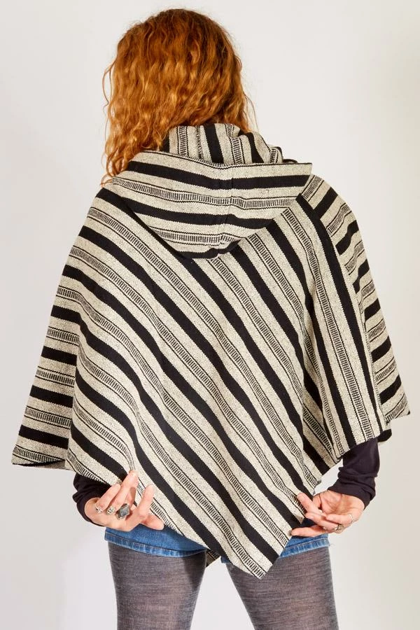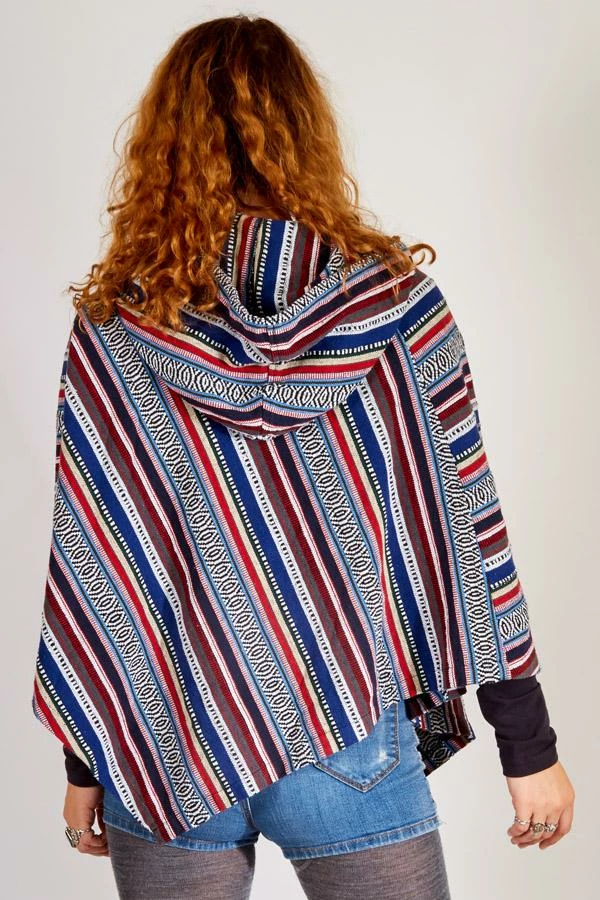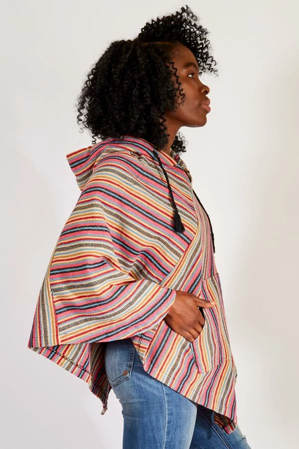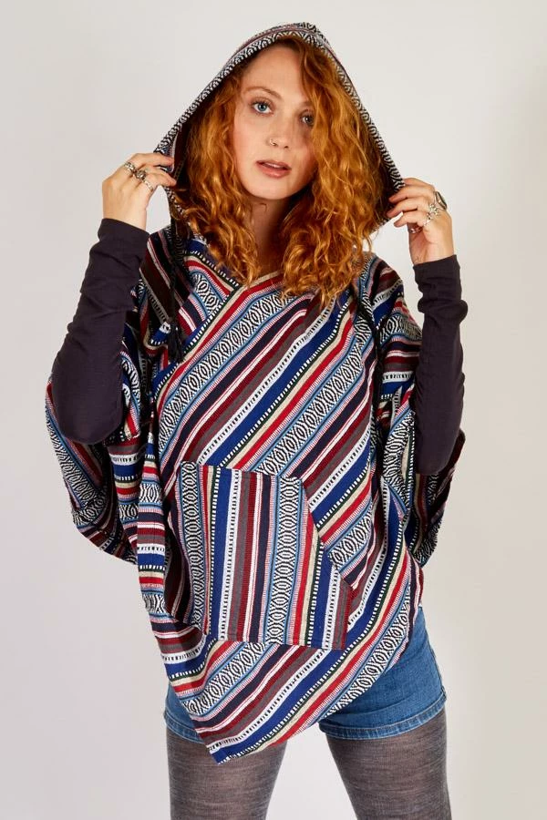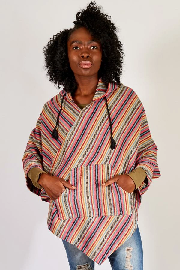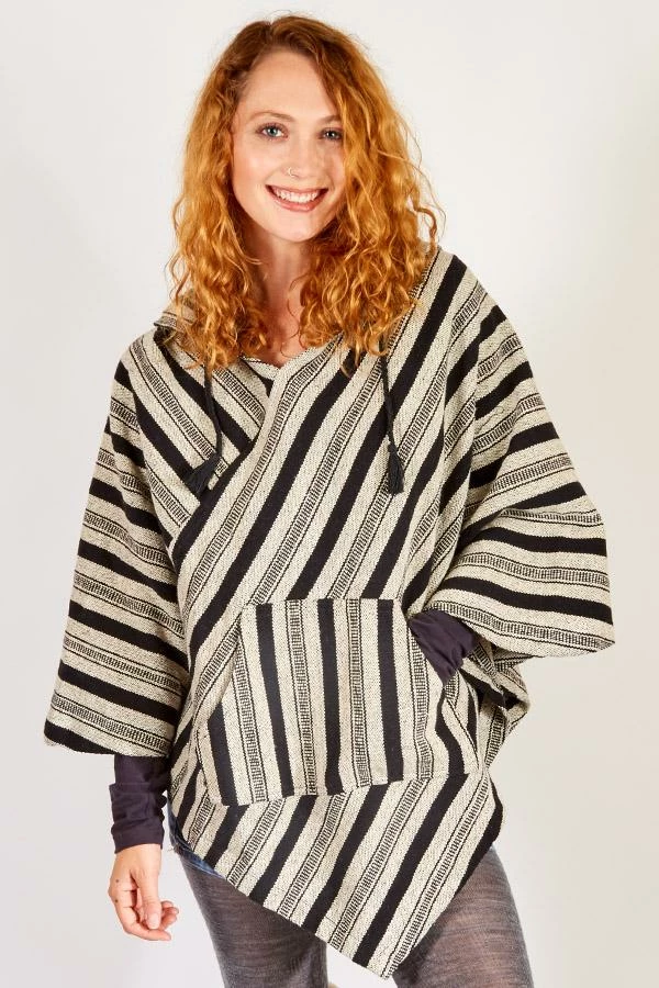 Inspired by woodstock, this hooded poncho helps you relive the spirit of the 60s. The fabric is custom woven for us in Nepal of 100% cotton and then enzyme washed to give it that soft worn vintage feel, The hood is generously with a tasseled drawstring and the shoulders are gently shaped for a comfortable fit. A front kangaroo pocket is great for stashing your phone, keeping your hands warm, or just striking a pose.