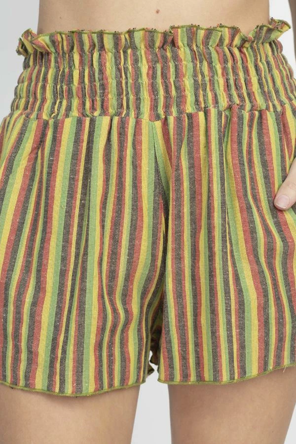 Our summer, try our easy fit high rise paper bag waist rasta shorts made from our exclusive soft cotton stripe fabric. The waistband is wide with soft elastic for a flattering fit. The side pockets are generous and the legs are a loose breezy fit.
